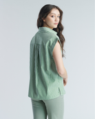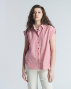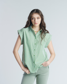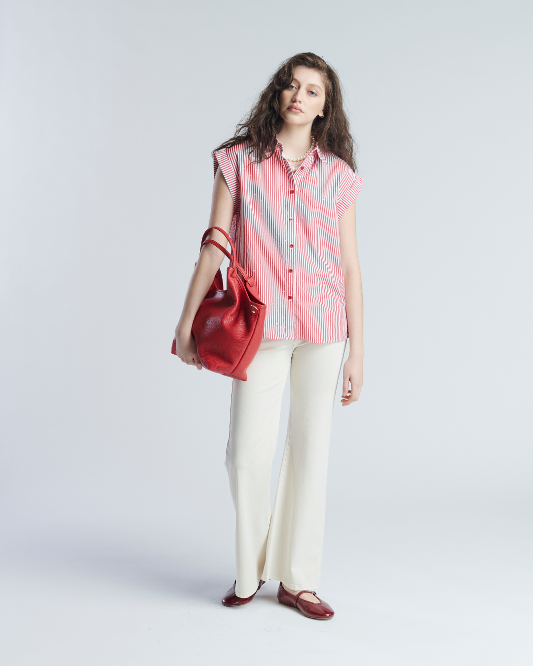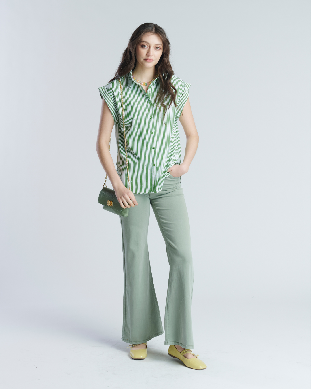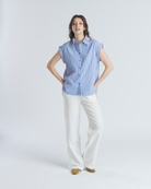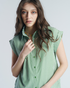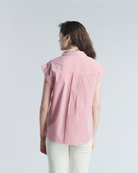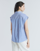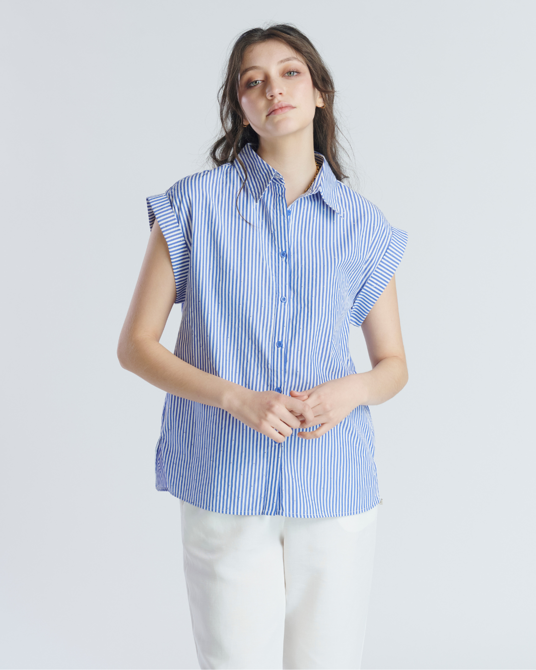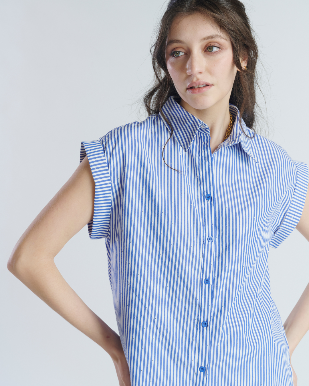 Blusa listada con bello detalle de strass. Ajuste holgado y con mangas enrrolladas. Costura fruncida en el centro de la parte posterior.