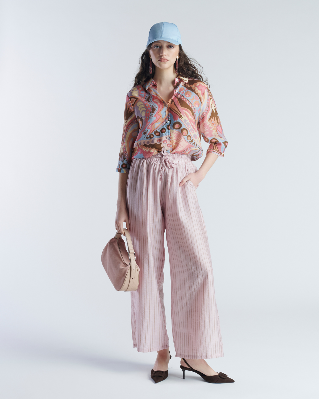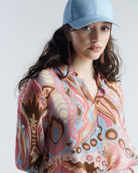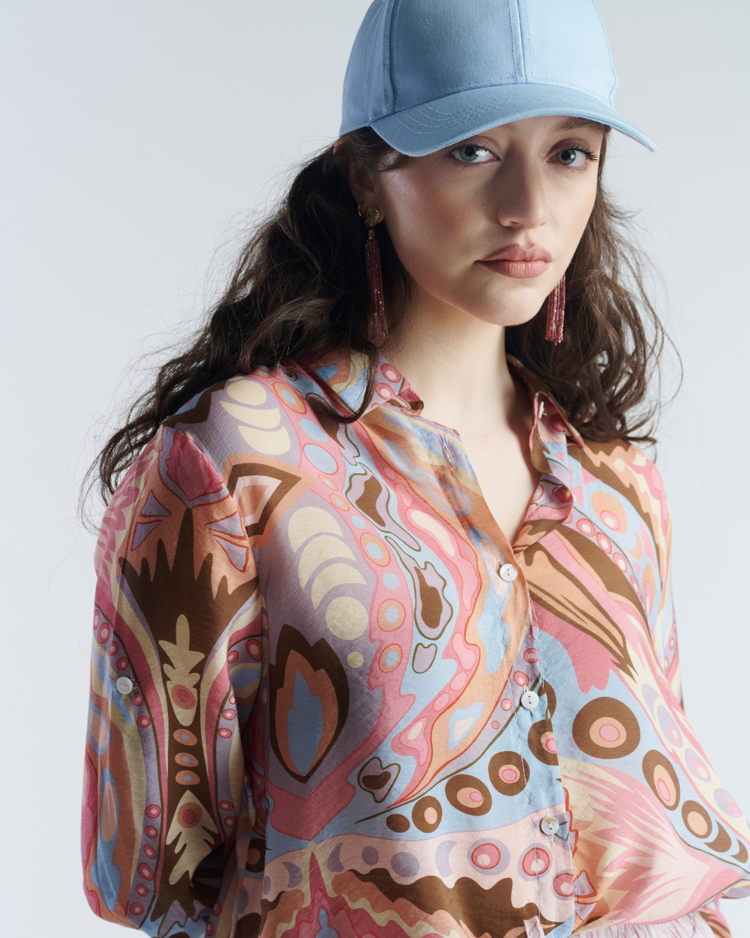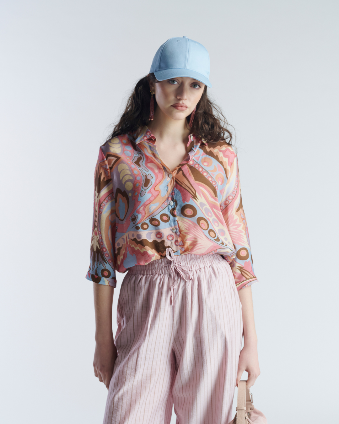 Blusa de tela vaporosa con bello print floral. Manga 3/4 con puño abotonado. Ligeramente más largo en la parte posterior y con fruncido en el centro.