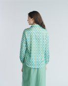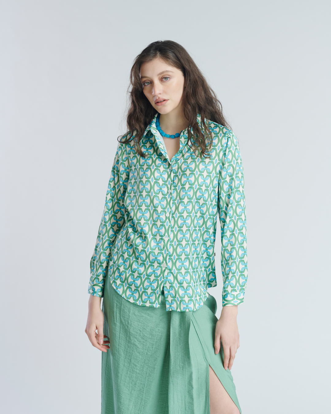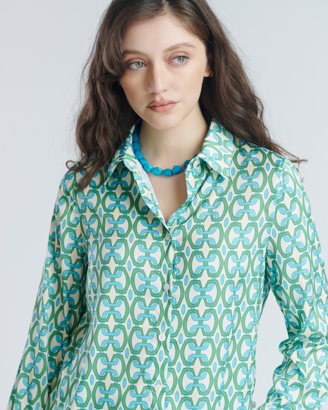 Dale un aire fresco y sofisticado a tu look con esta camisa de manga larga y cuello clásico. Su diseño se destaca por el vibrante estampado geométrico en tonos verde y celeste que aporta dinamismo y estilo a cualquier outfit. Confeccionada en tela ligera y fluida, ofrece una capida elegante y un calce cómodo, ideal para usar tanto en la oficina como en ocasiones casuales.