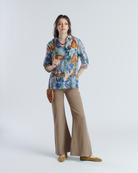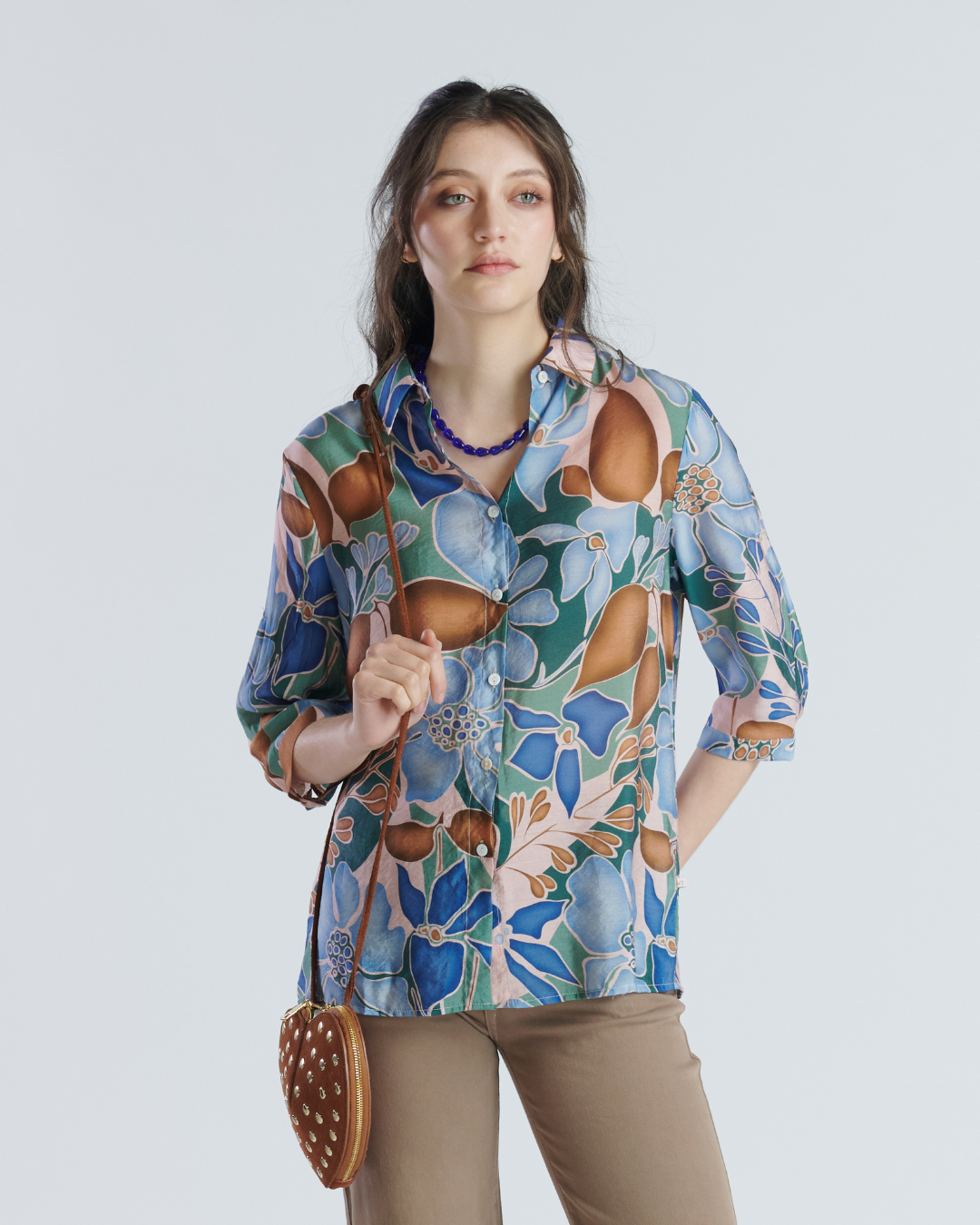 Blusa de tela vaporosa con bello print floral. Manga 3/4 con puño abotonado. Ligeramente más largo en la parte posterior y con fruncido en el centro.