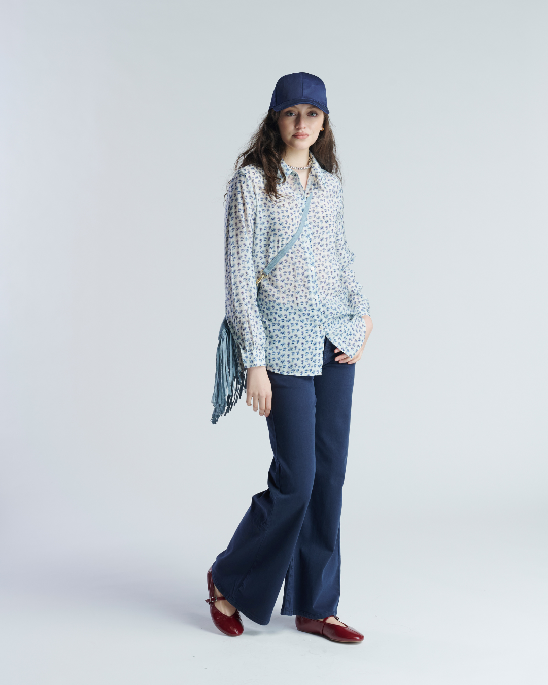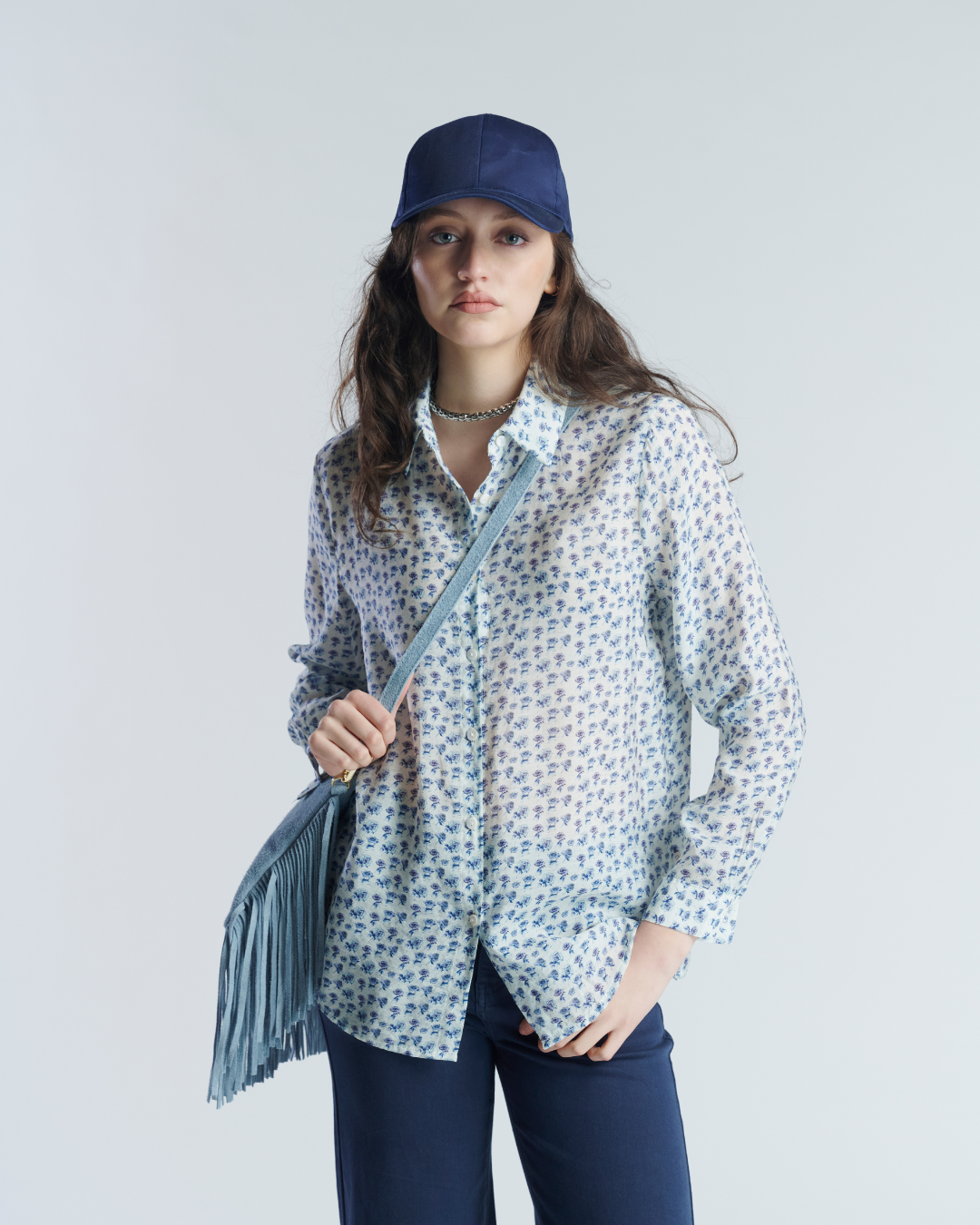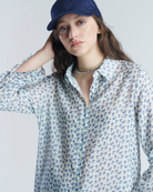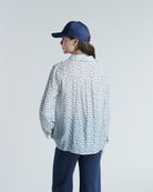 Blusa de tela vaporosa con patrón floreado. Mangas largas y ajuste holgado con hombros ligeramente caídos. Costura cruzada en espalda con pequeño fruncido en el centro.