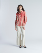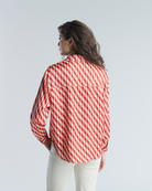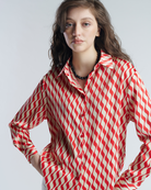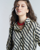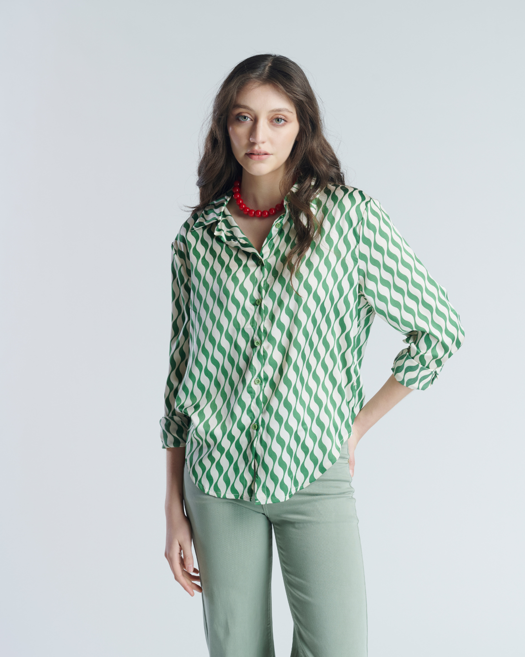 Blusa satinada con estampado ondulado. Una prenda elegante y versátil que aporta frescura y estilo a cualquier look. Confeccionada en satín suave y ligero, luce un estampado de ondas verdes sobre fondo blanco que crea un efecto visual moderno y sofisticado.