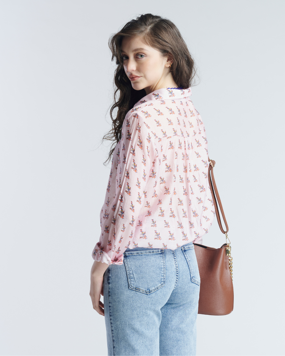 Blusa camisera de tela vaporosa. Manga larga con hombros ligeramente caídos. Relieve en parte posterior con costura fruncida en el centro.
