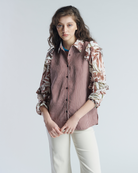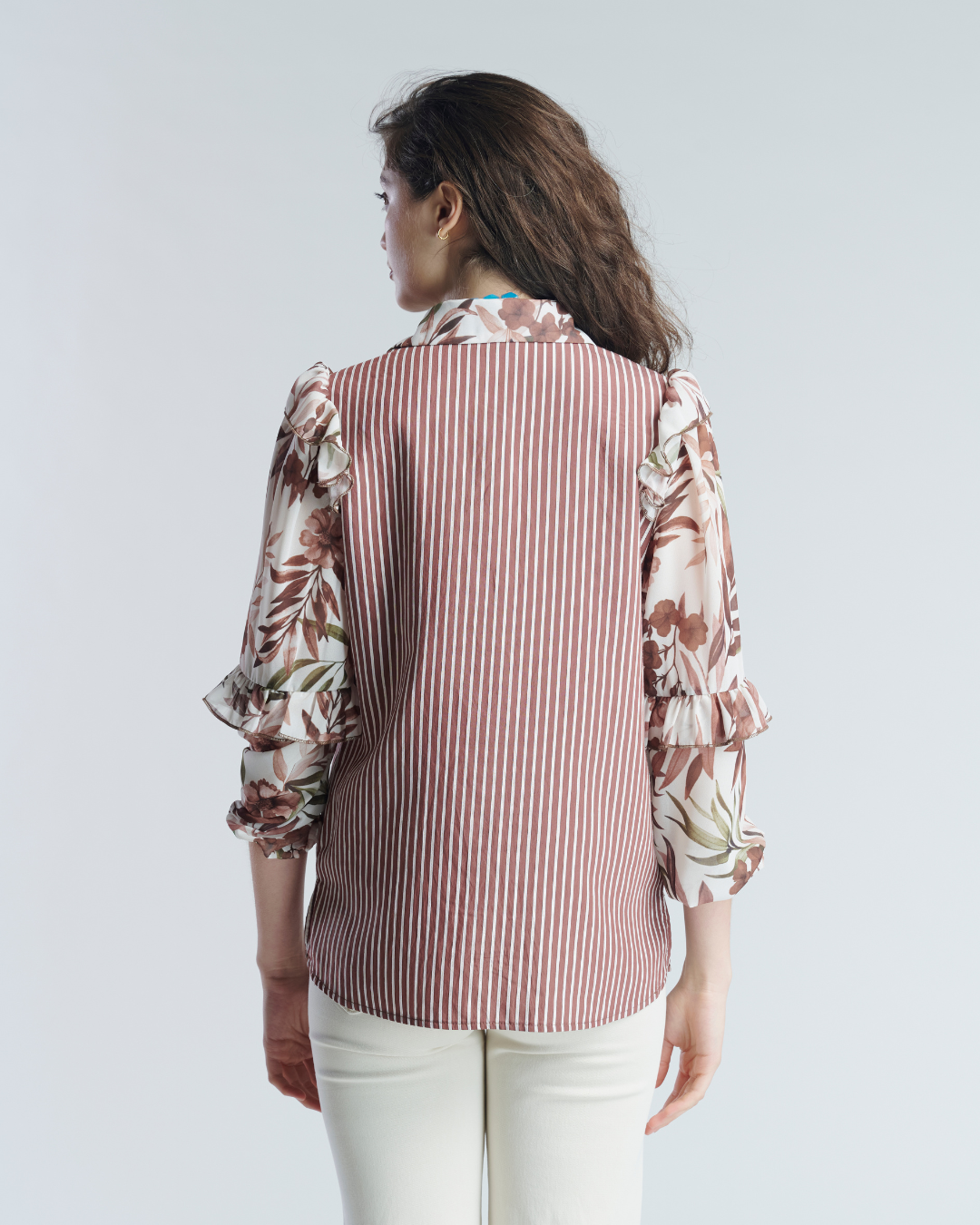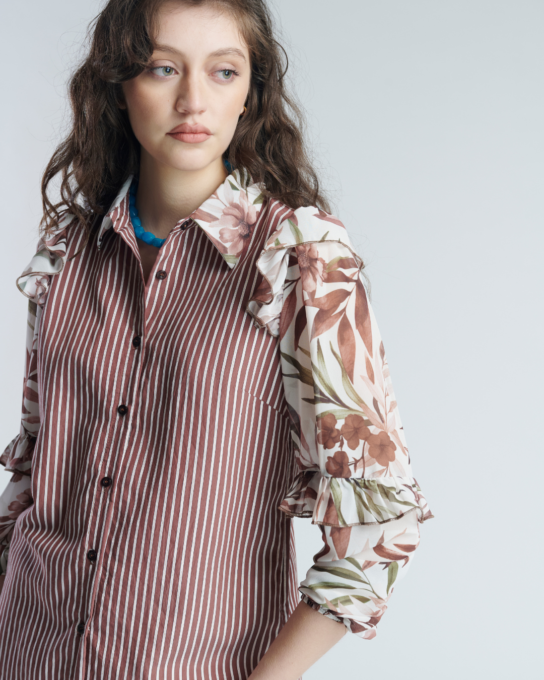Camisa listada con manga vaporada y con bellos vuelos. Manga abullonada con vuelos y elasticada en puño. Print floral en mangas y cuello. Cierre frontal en botones.