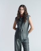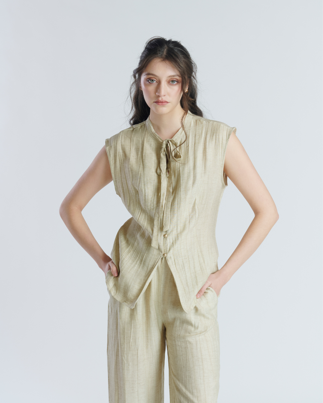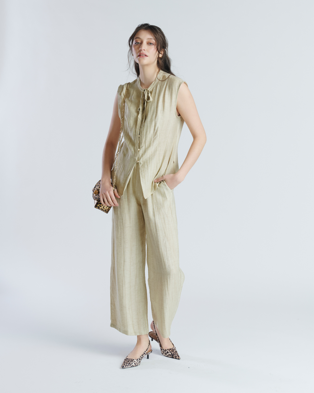 Conjunto ligero de tela corrugada. Blusa sin mangas con cuello mao terminado en lazo. Cierre frontal con botones perlados y leve apertura en parte inferior. Pantalón holgado con pretina elasticada y bolsillos a los cotados. Muy ligero y fresco ideal para tardes de verano.
