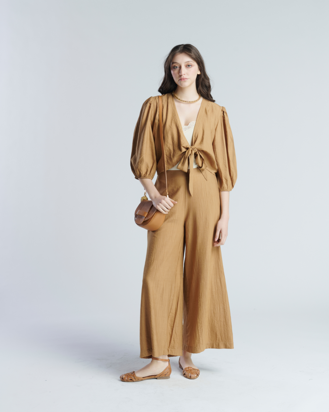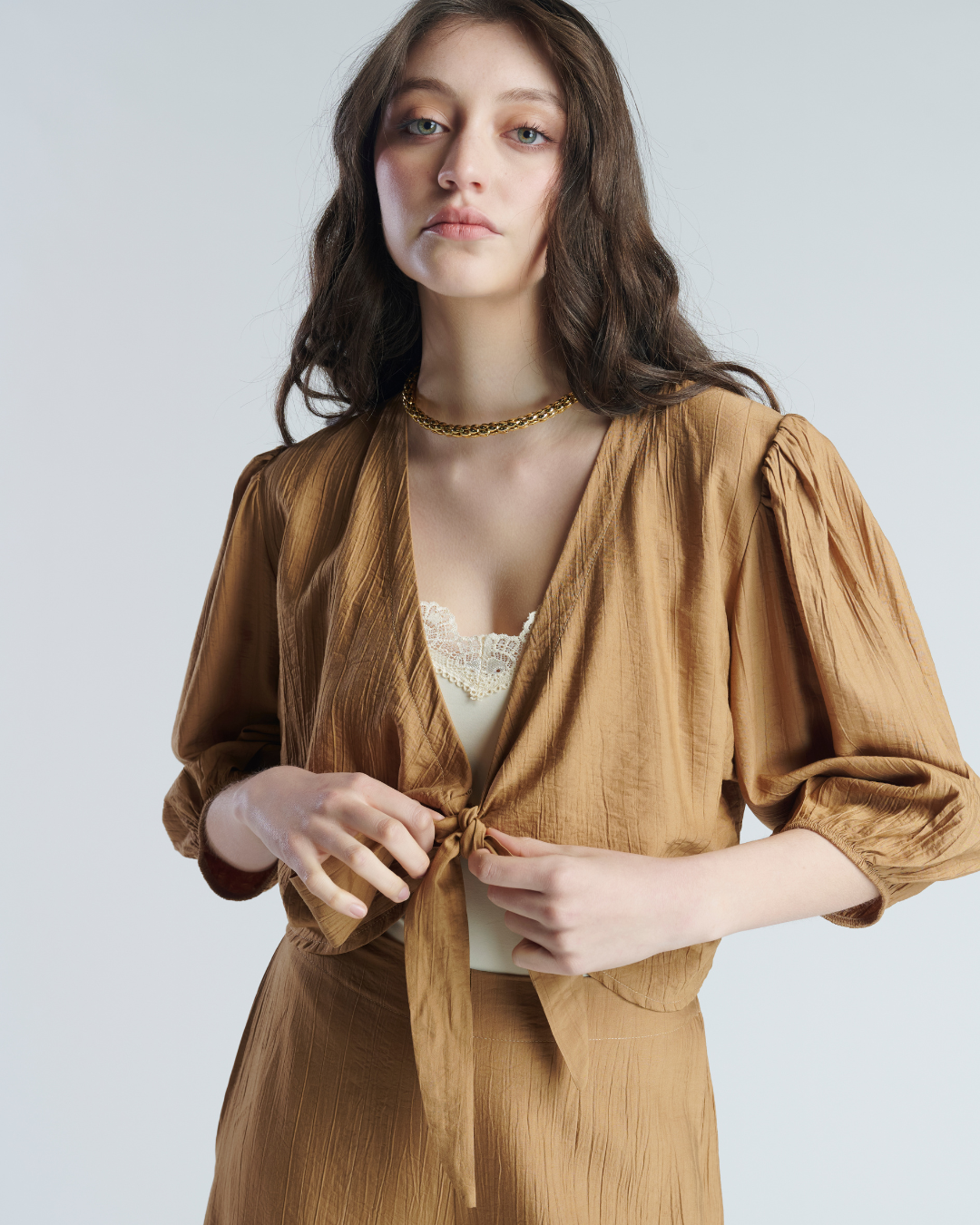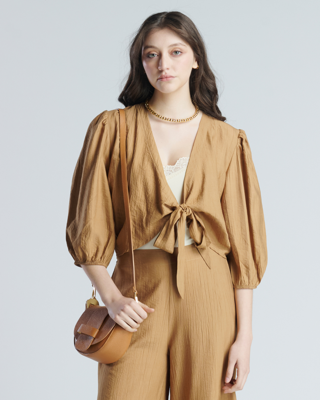 Top de tela corrugada en rayon. Ligera y fresca ideal para días de verano. Escote abierto con cierre en lazo central a la altura del busto. Manga abullonada 3/4 que aporta estilo y frescura. Tiene pretina a la cintura que favorece la figura.