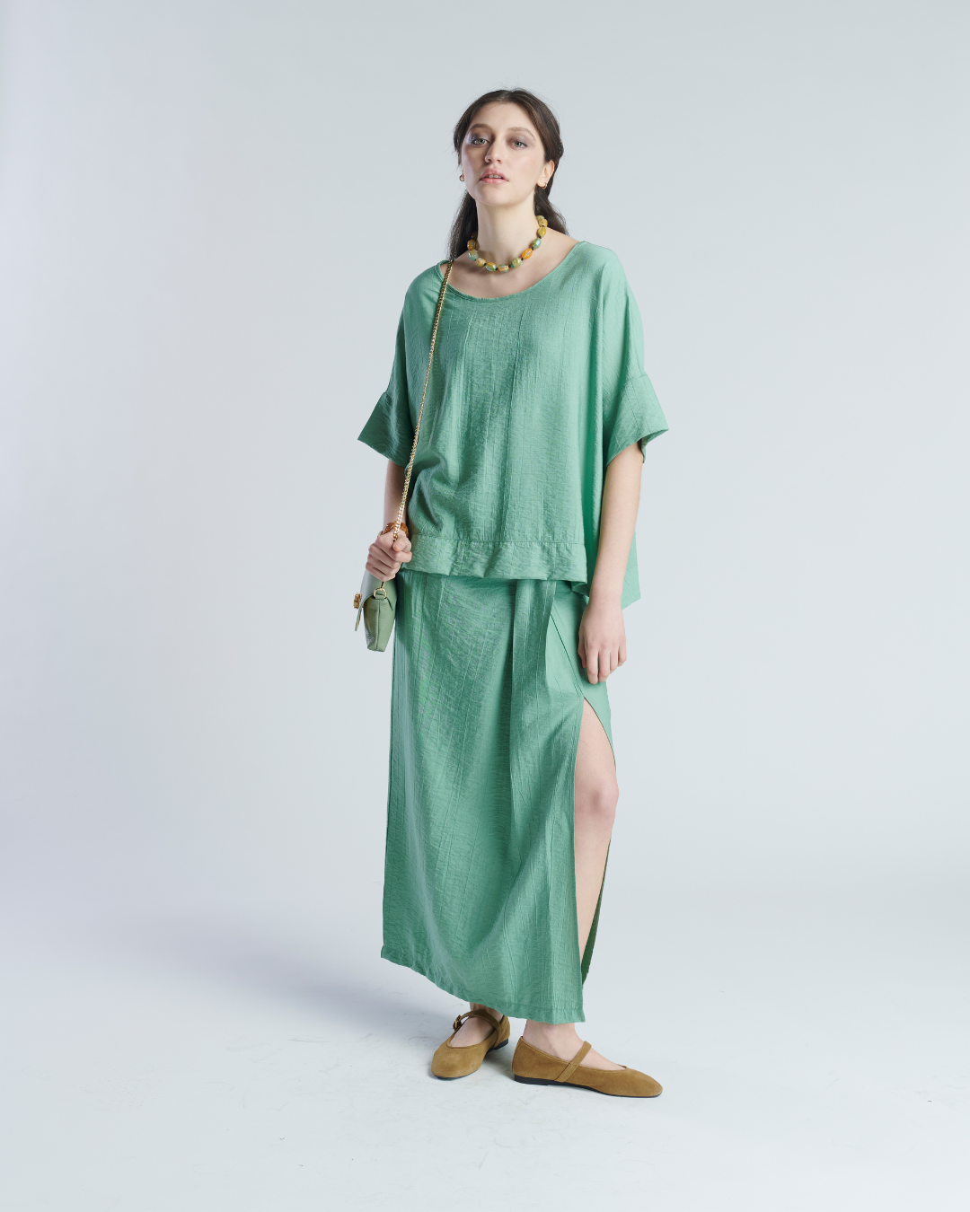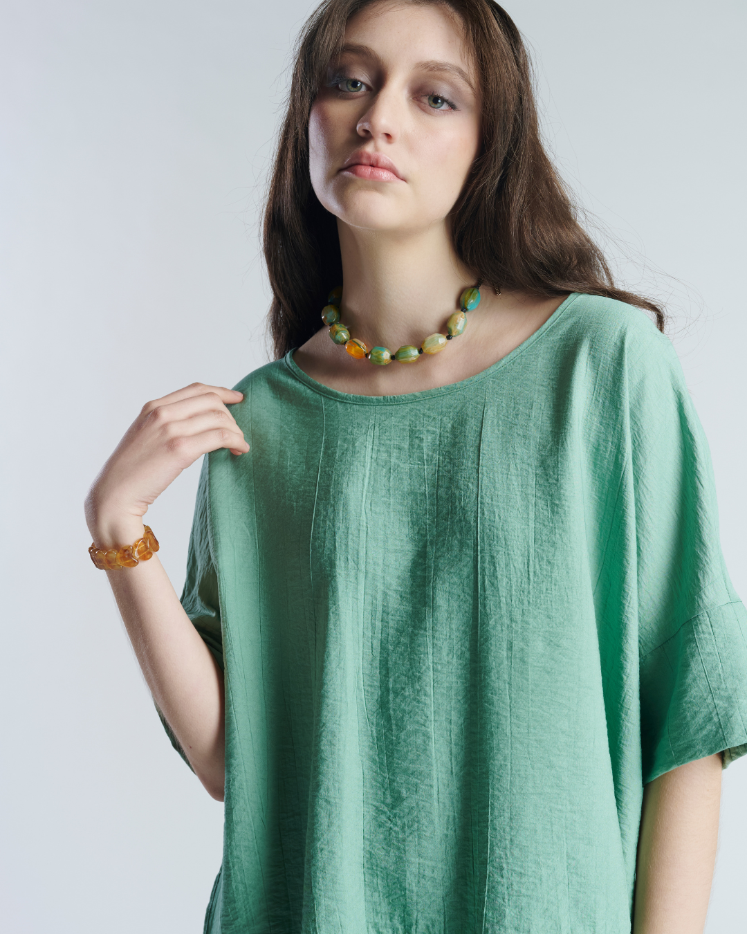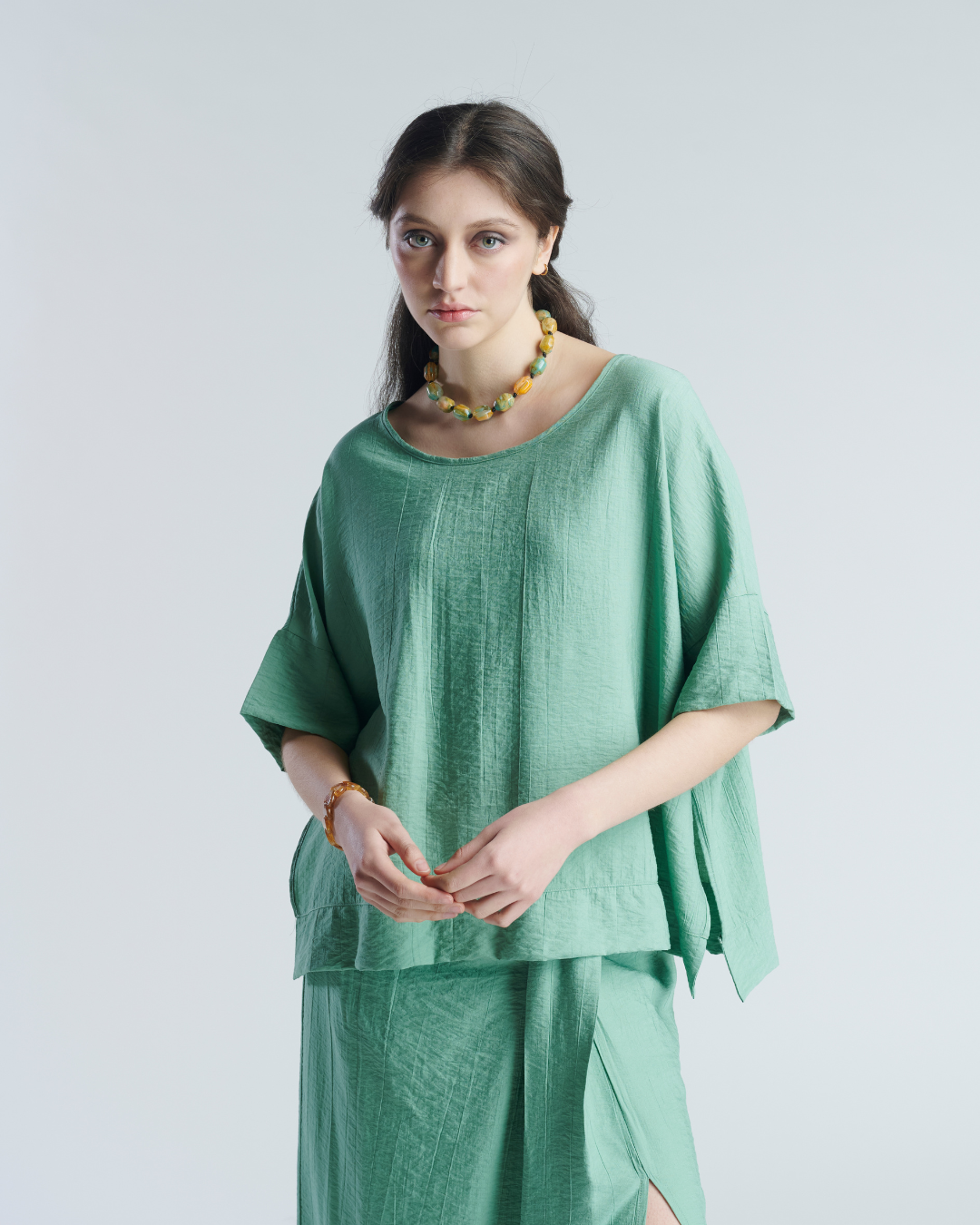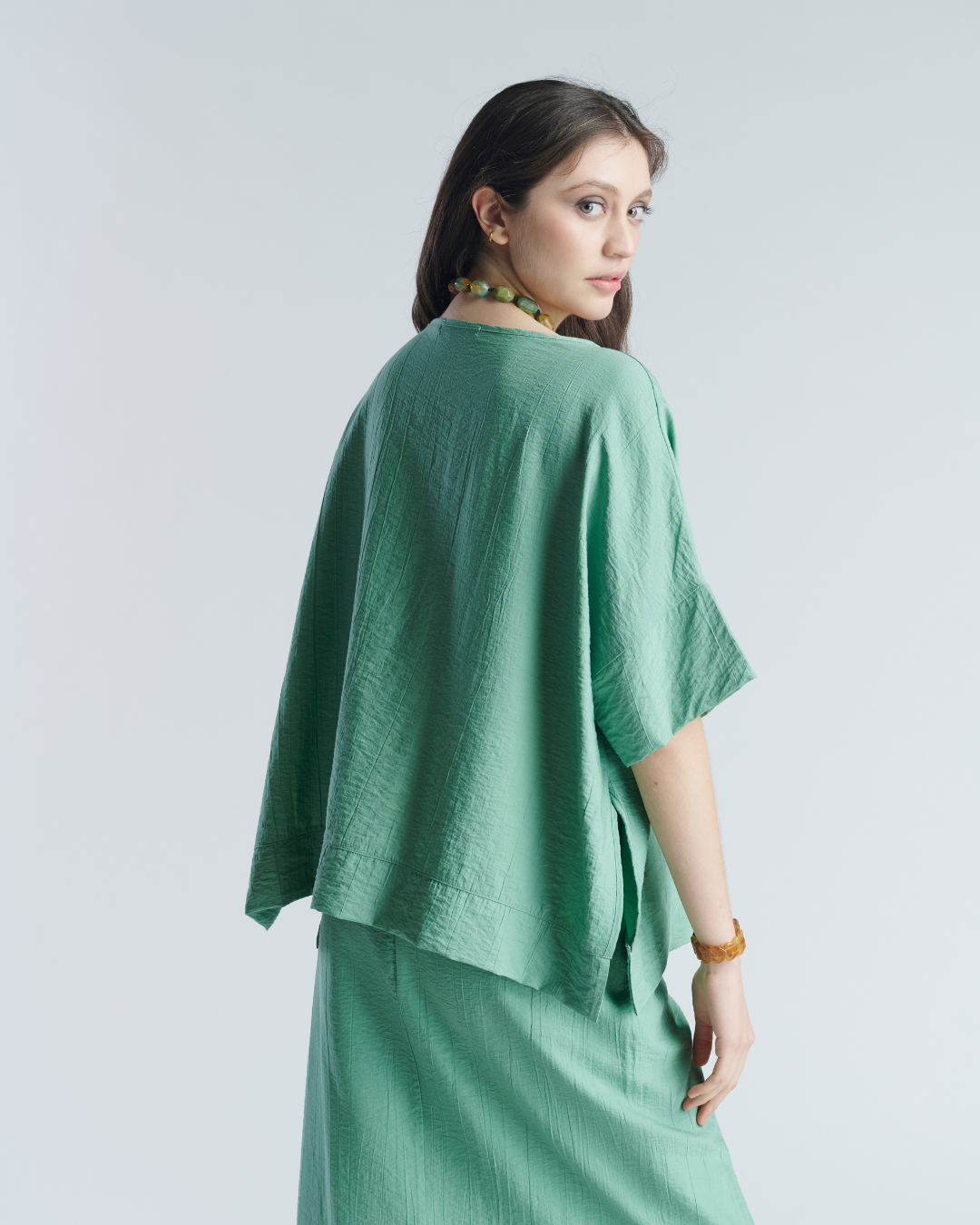 Blusón de tela corrugada en rayon. Ajuste holgado y liviano, muy fresco ideal para días de verano. Manga 3/4 y suelto en la parte inferior lo que otorga movimiento y estilo.