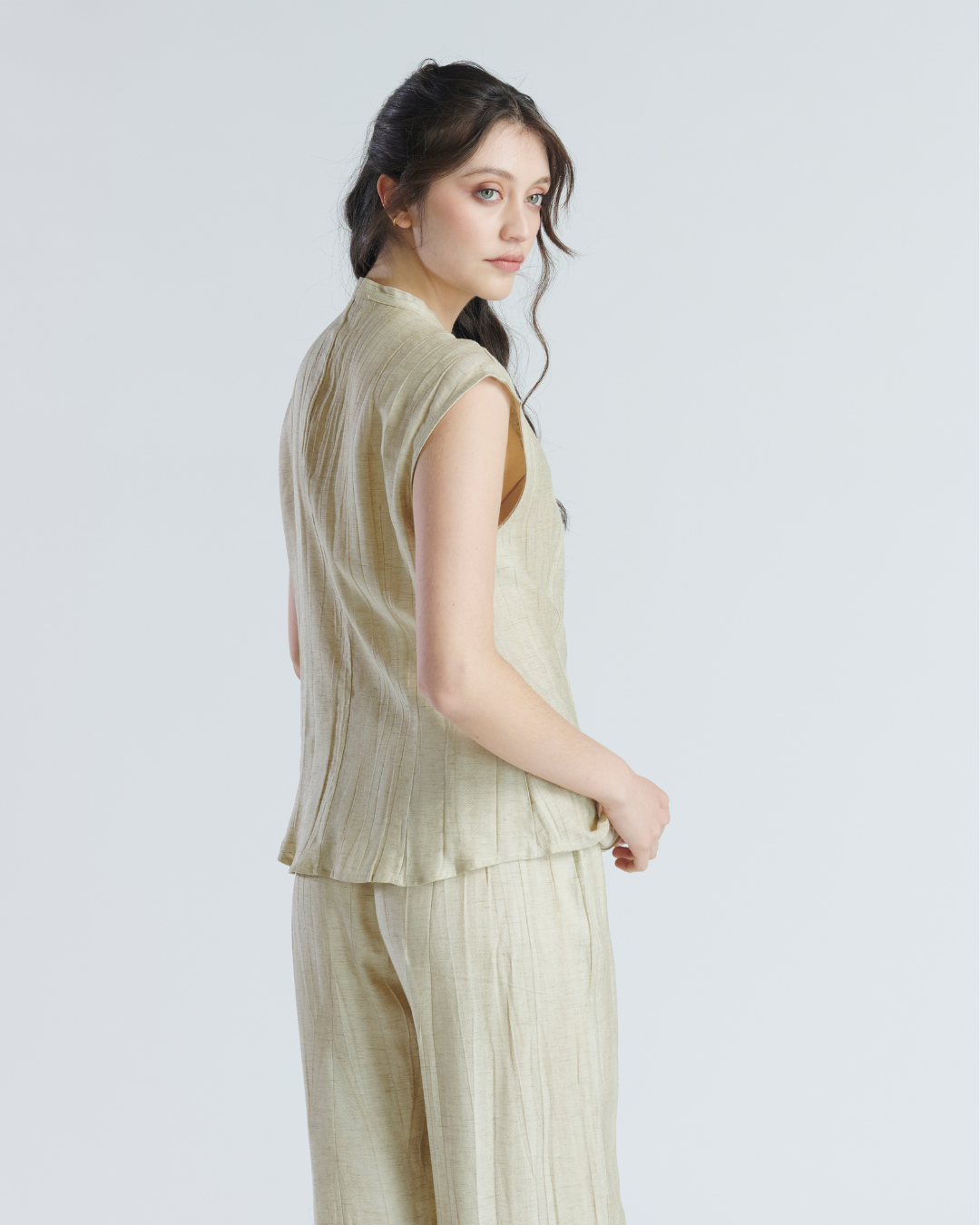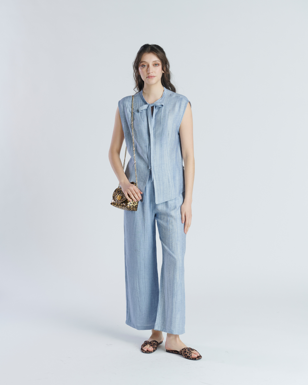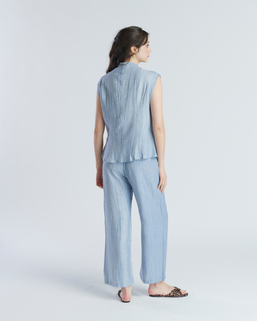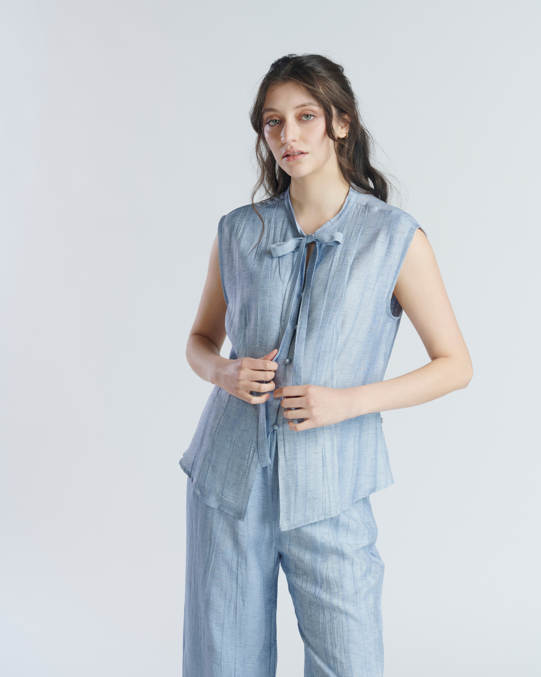 Conjunto ligero de tela corrugada. Blusa sin mangas con cuello mao terminado en lazo. Cierre frontal con botones perlados y leve apertura en parte inferior. Pantalón holgado con pretina elasticada y bolsillos a los cotados. Muy ligero y fresco ideal para tardes de verano.