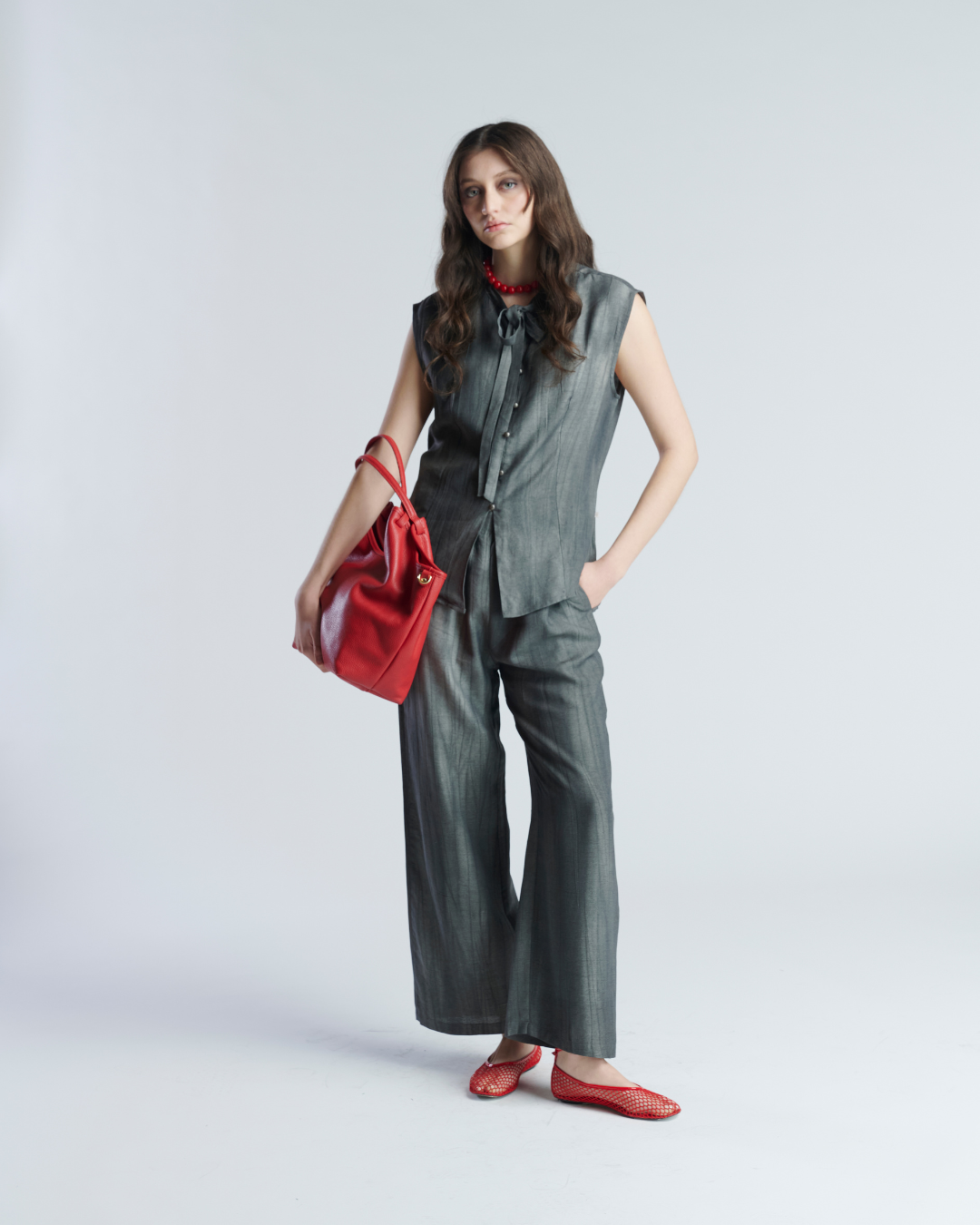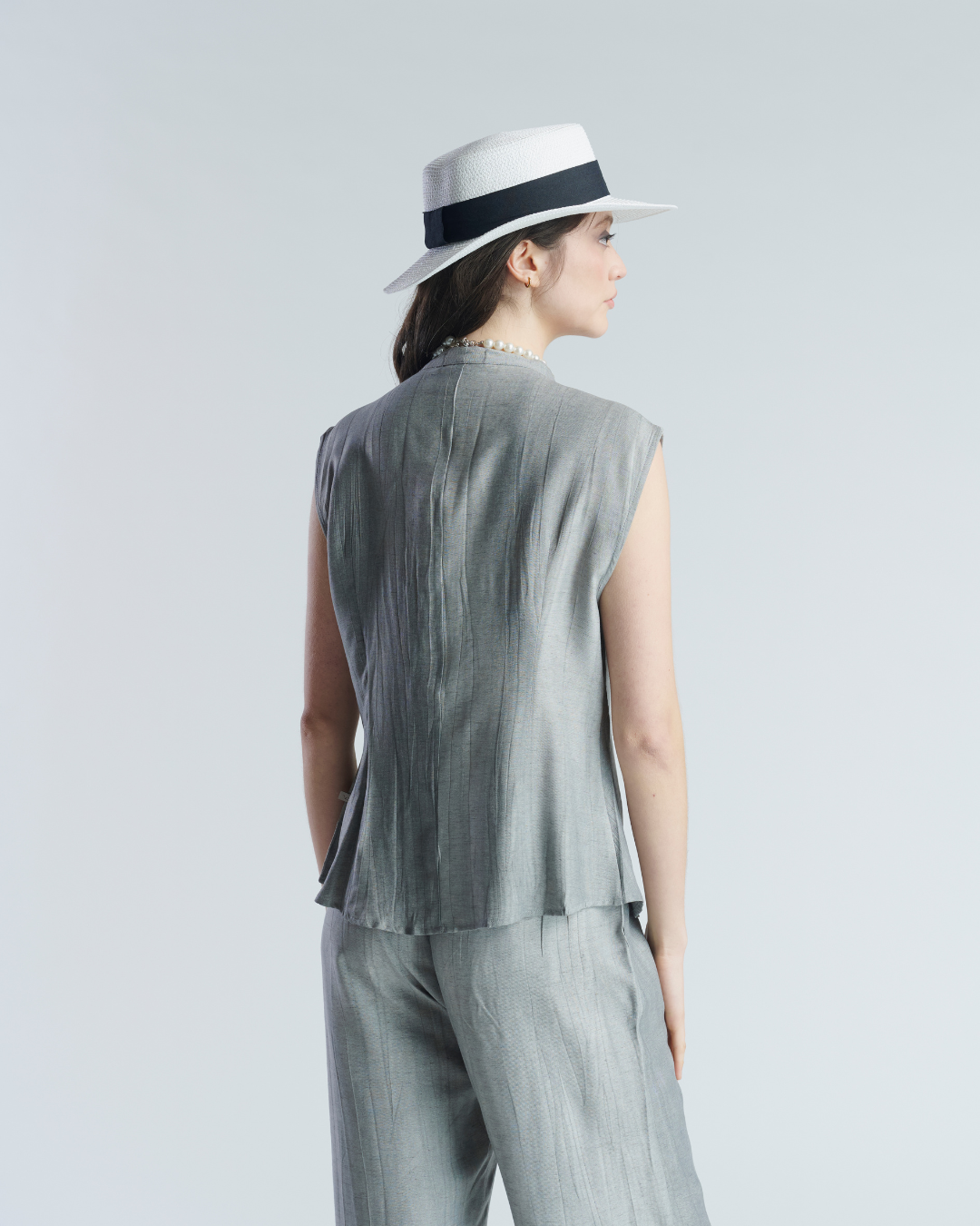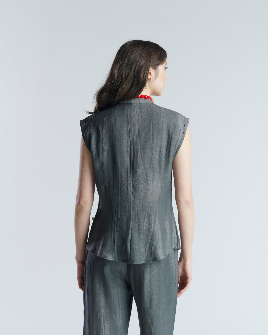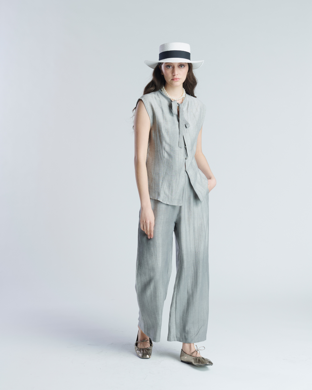 Conjunto ligero de tela corrugada. Blusa sin mangas con cuello mao terminado en lazo. Cierre frontal con botones perlados y leve apertura en parte inferior. Pantalón holgado con pretina elasticada y bolsillos a los cotados. Muy ligero y fresco ideal para tardes de verano.