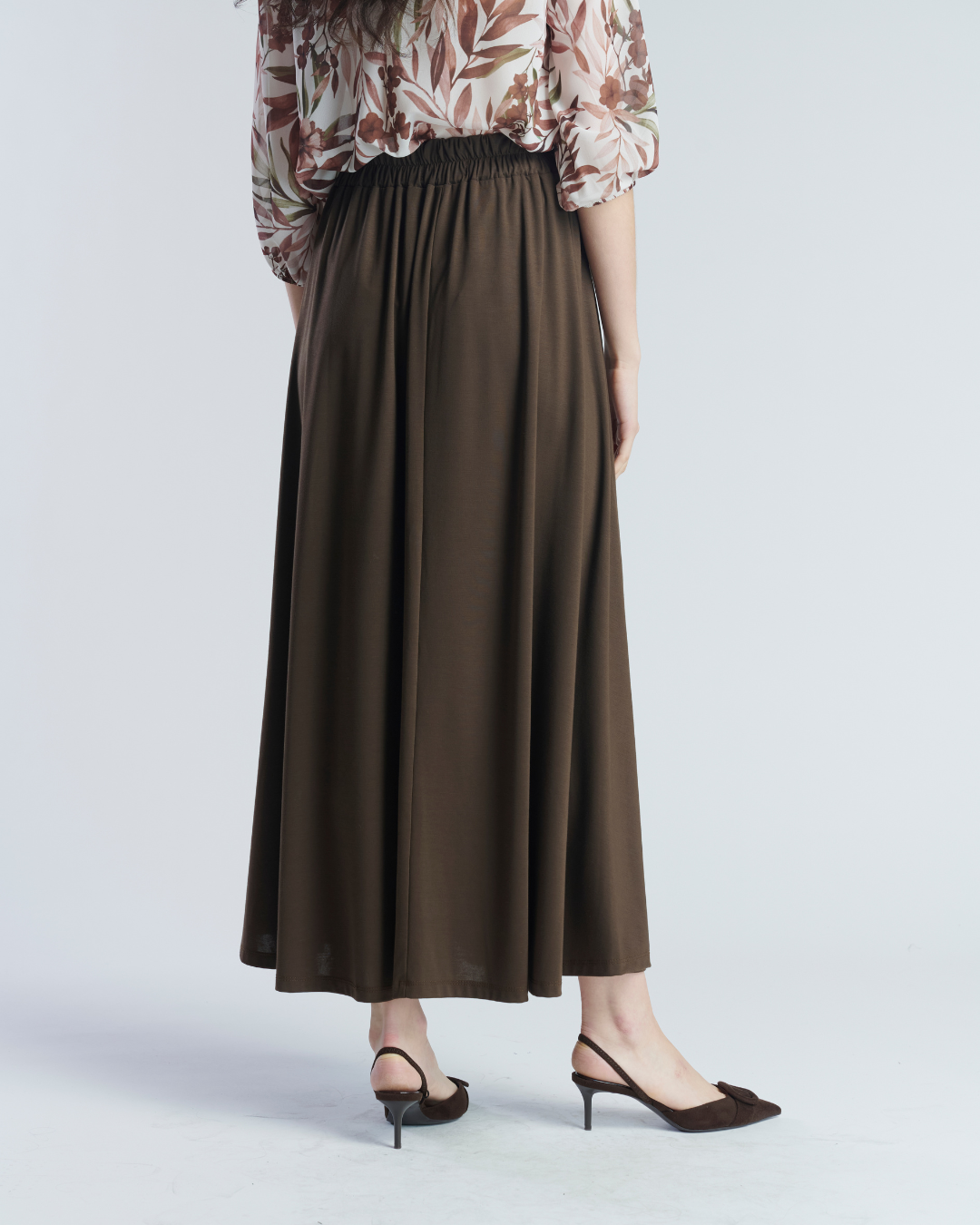 Falda midi acampanada con costura fruncida en la parte delantera y elasticada que favorece la figura. Tela de punto fino y muy cómoda.