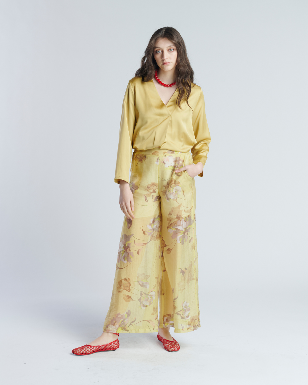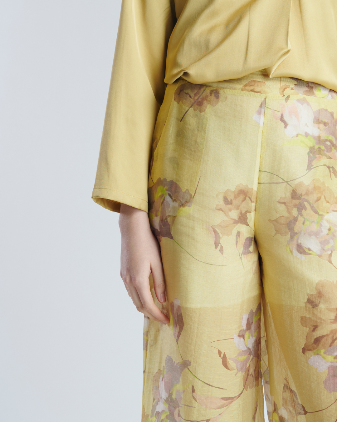 Pantalón wide leg de tacto vaporoso en tela gasa. Ajuste holgado con pretina elasticada, bolsillos delanteros y efecto ligeramente abullonado en la parte posterior. Tiene forro en la parte superior.