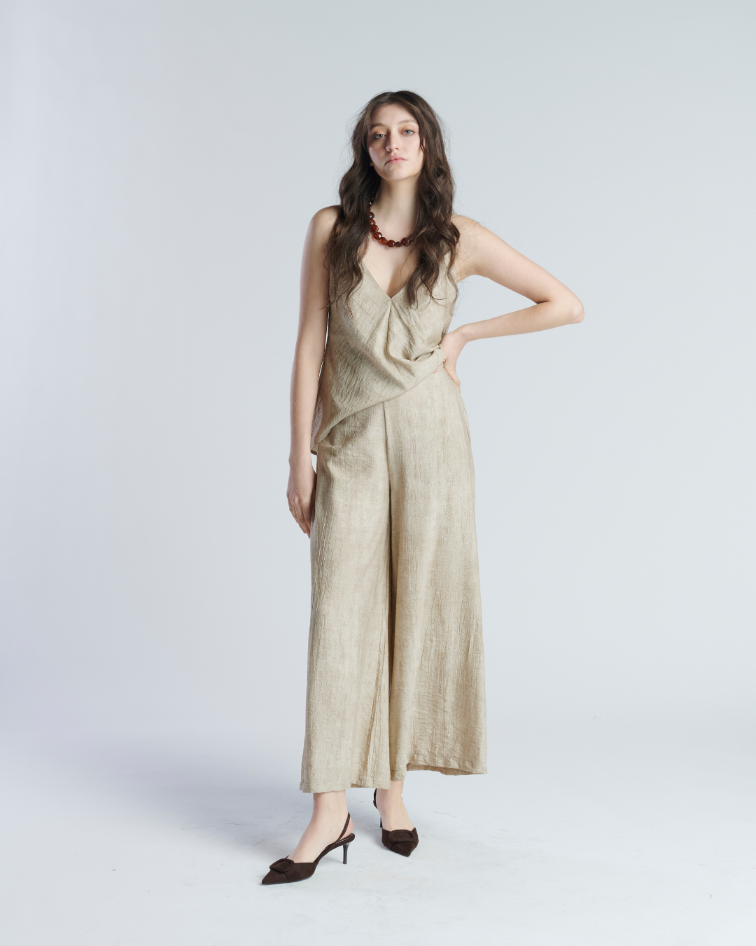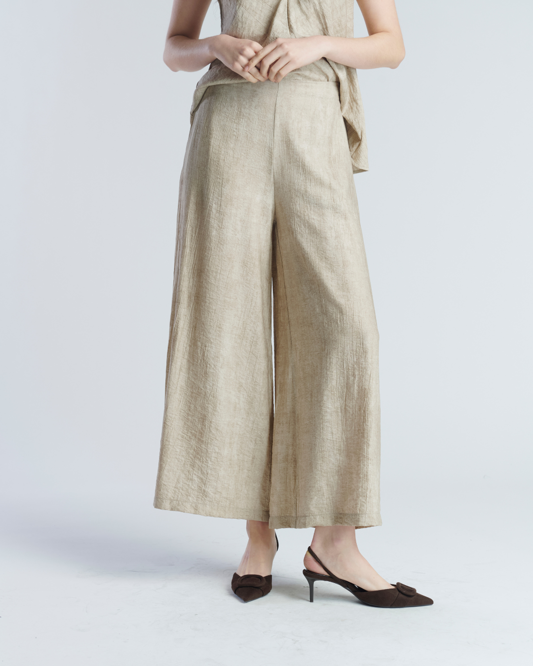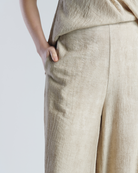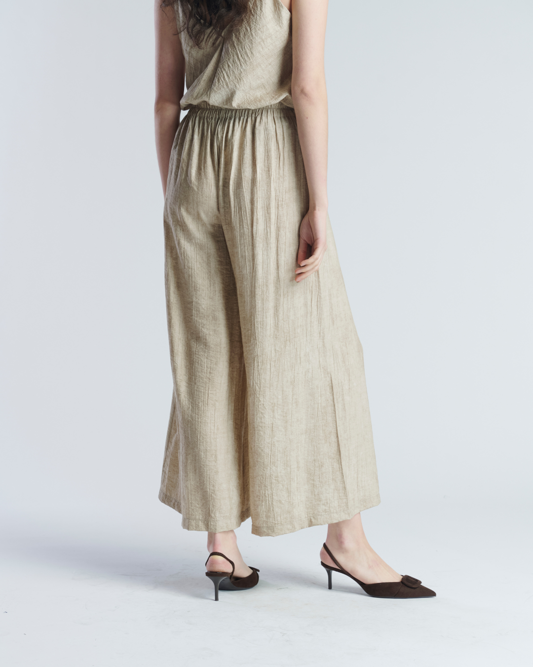 Pantalon palazzo corrugado, elasticado en la cintura y de tiro alto, con bolsillos ocultos a los costados. Muy liviano y fresco ideal para un look relajado y chic de verano.