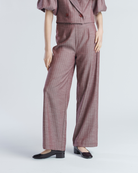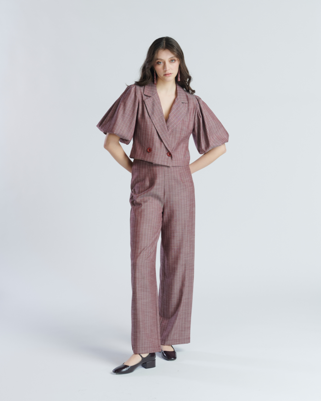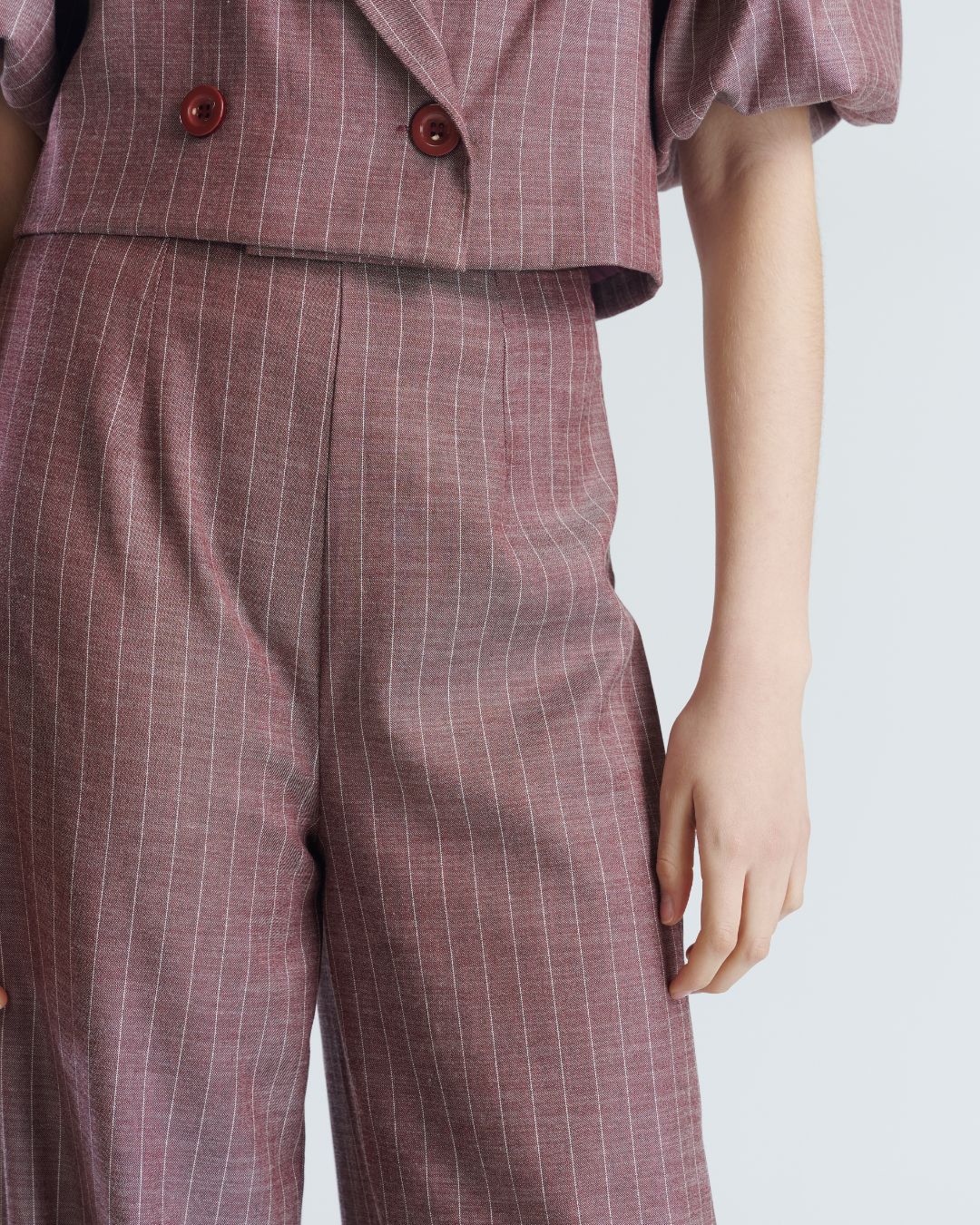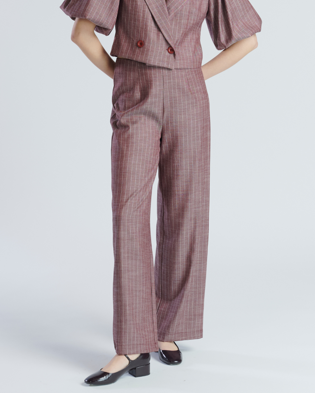 Pantalón listado de tela, de tiro y largo, con cierre al costado y bolsillos falsos en la parte posterior. Ideal para destacar en la oficina o en una cena formal.