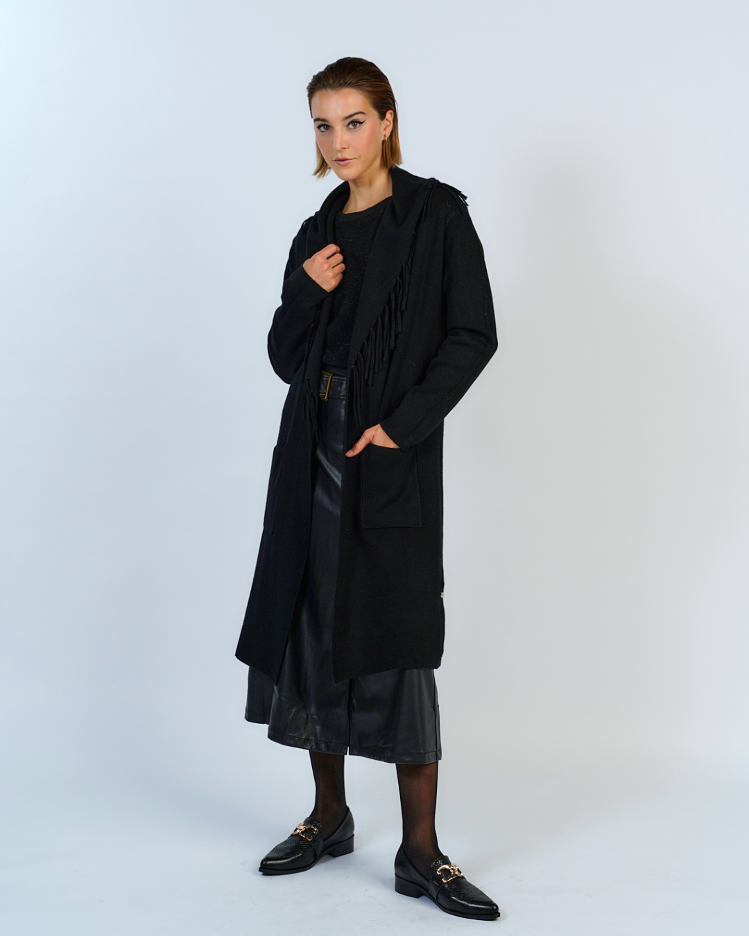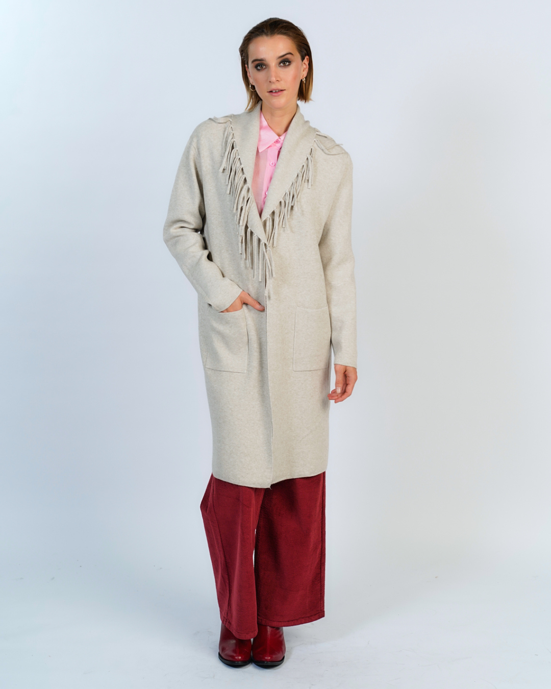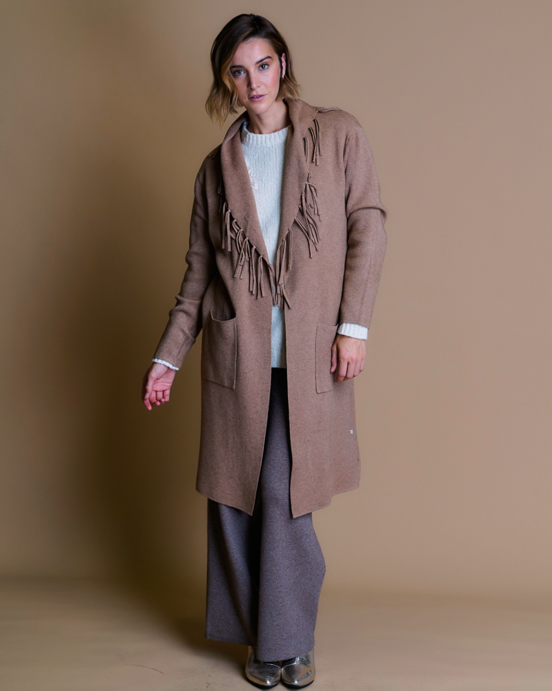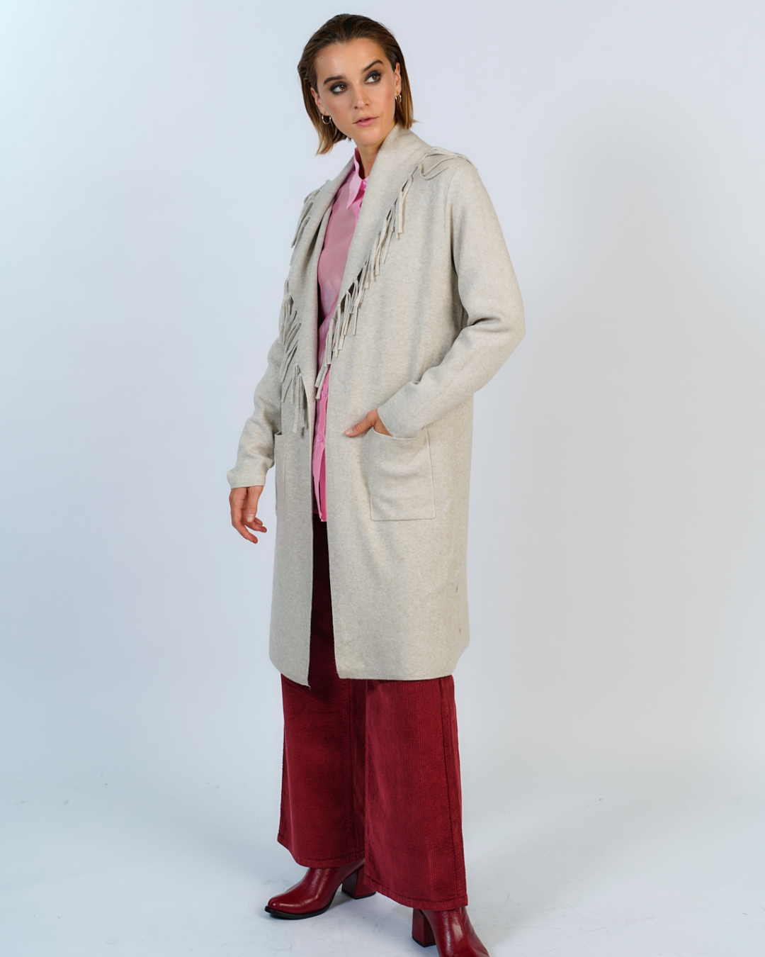 Abrigo de punto estilo cardigan, confeccionado en jersey tejido que le otorga suavidad y confort. Con flecos en los bordes para un toque bohemio y bolsillos grandes que añaden funcionalidad y estilo.