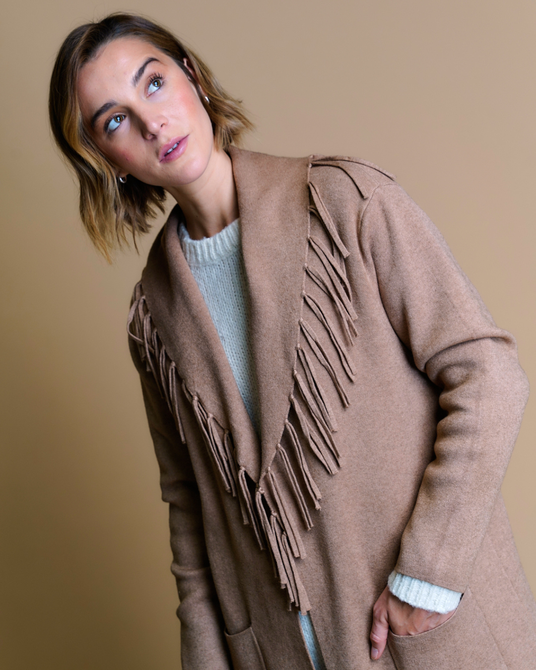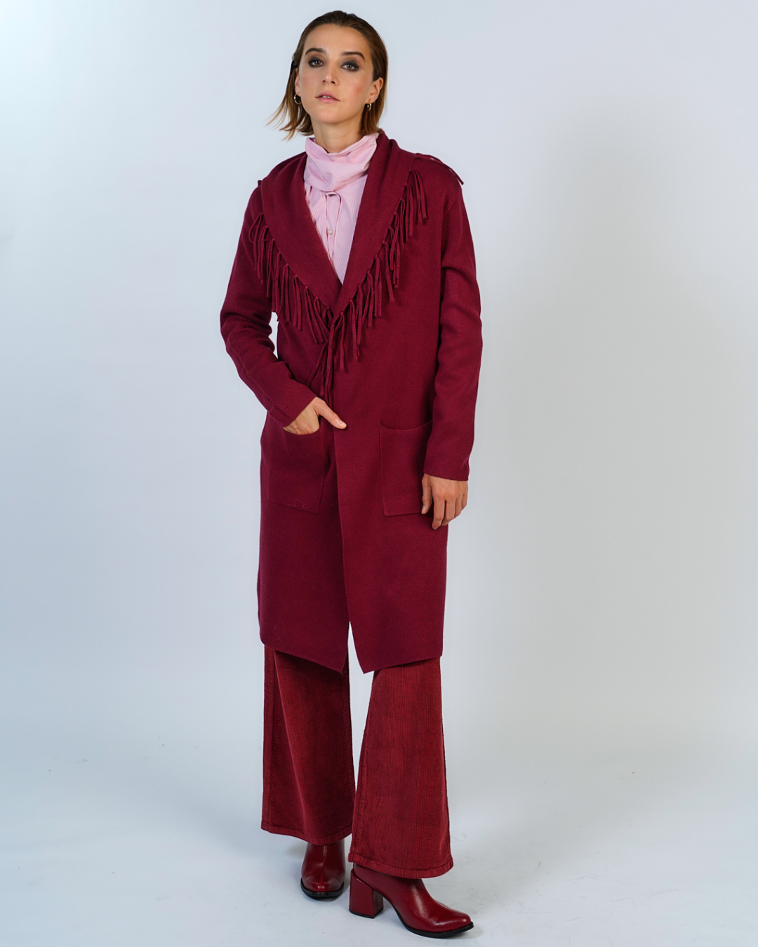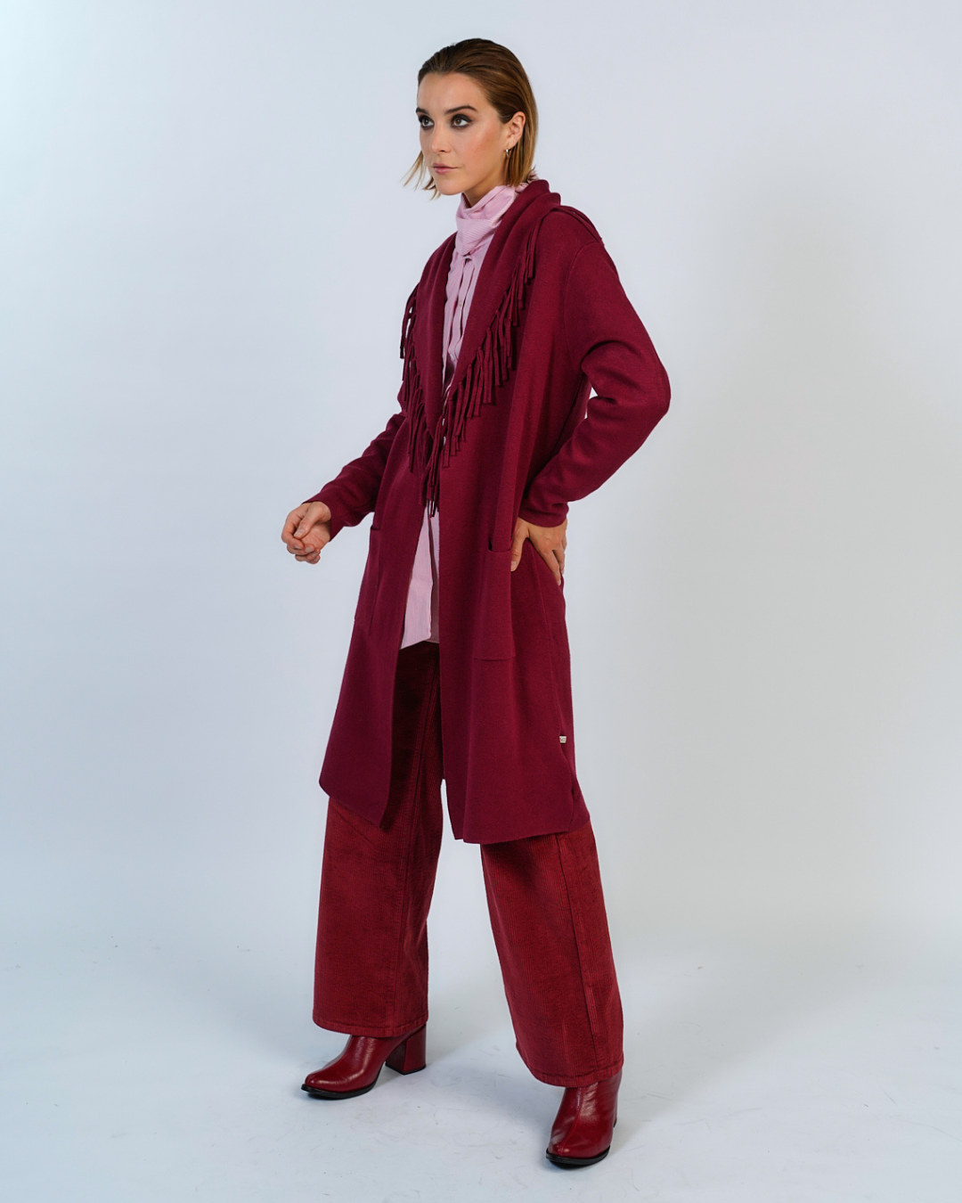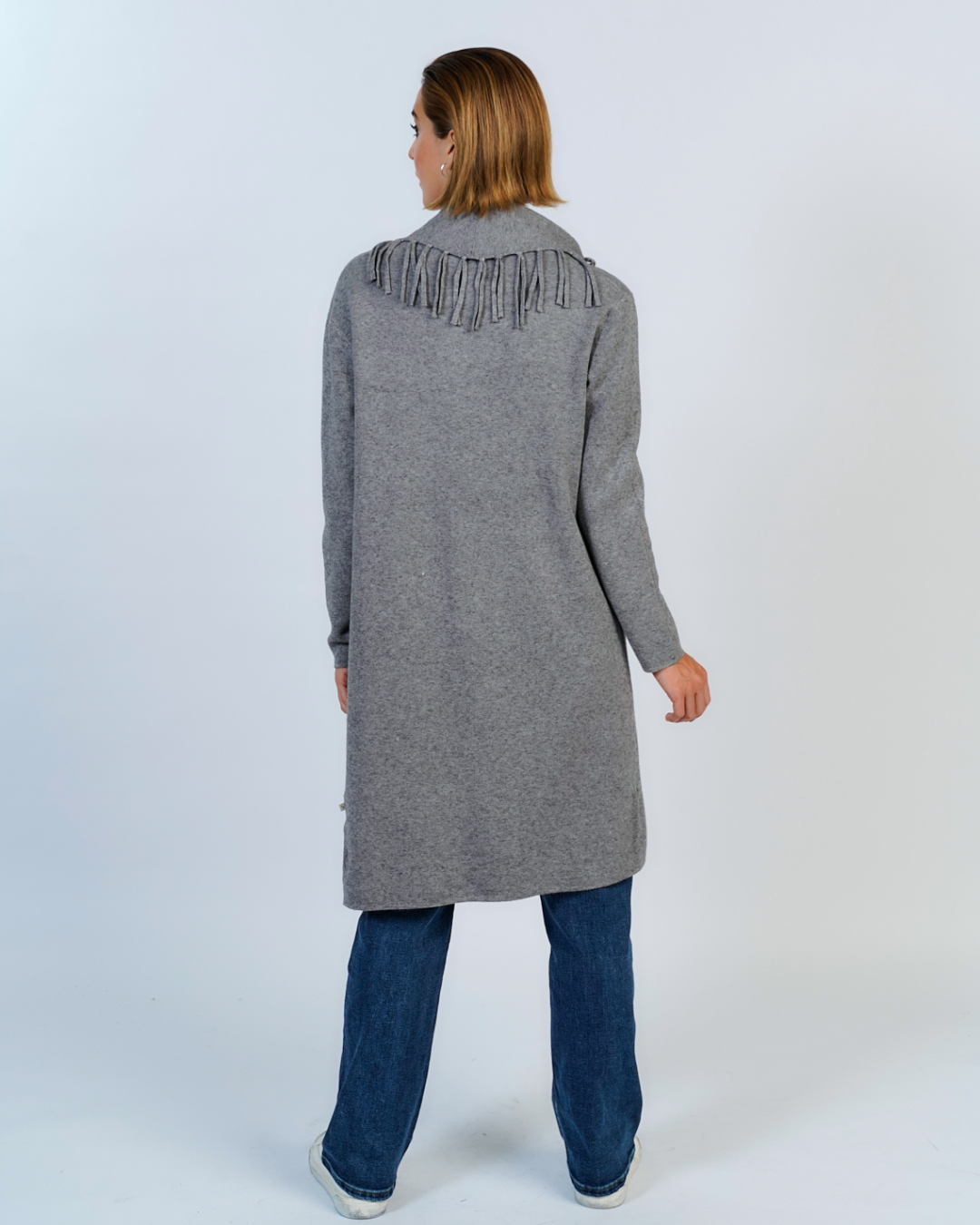 Abrigo de punto estilo cardigan, confeccionado en jersey tejido que le otorga suavidad y confort. Con flecos en los bordes para un toque bohemio y bolsillos grandes que añaden funcionalidad y estilo.