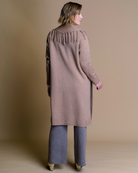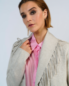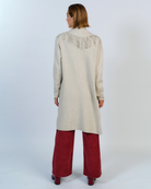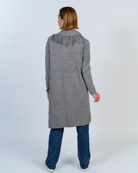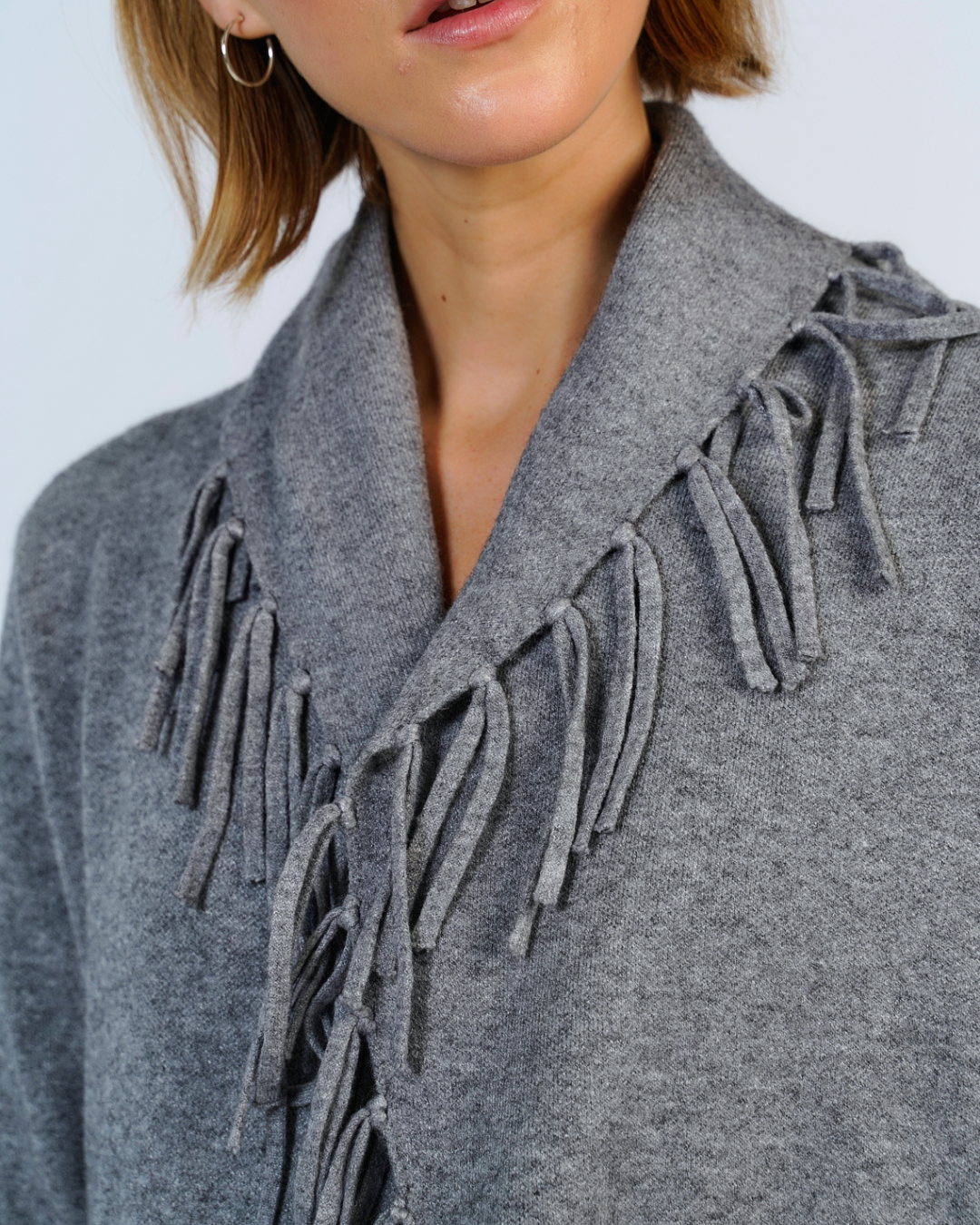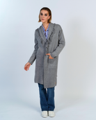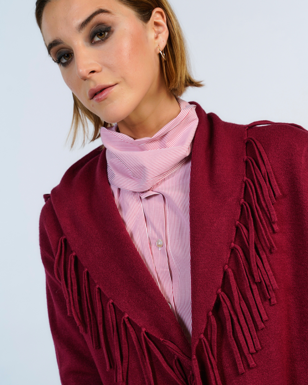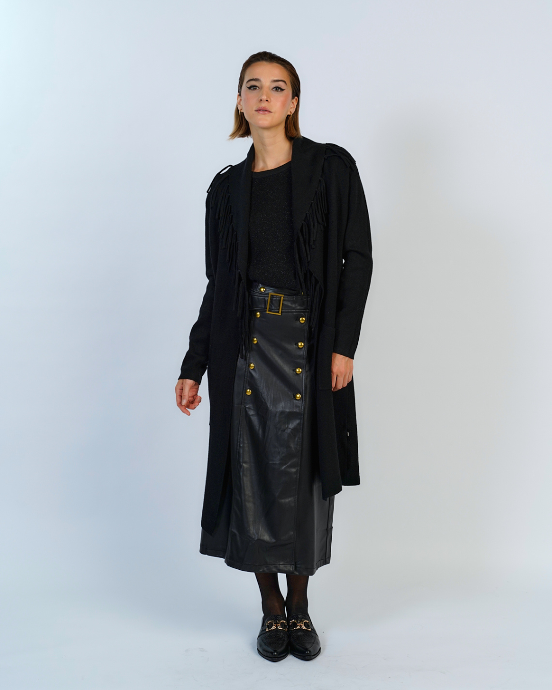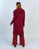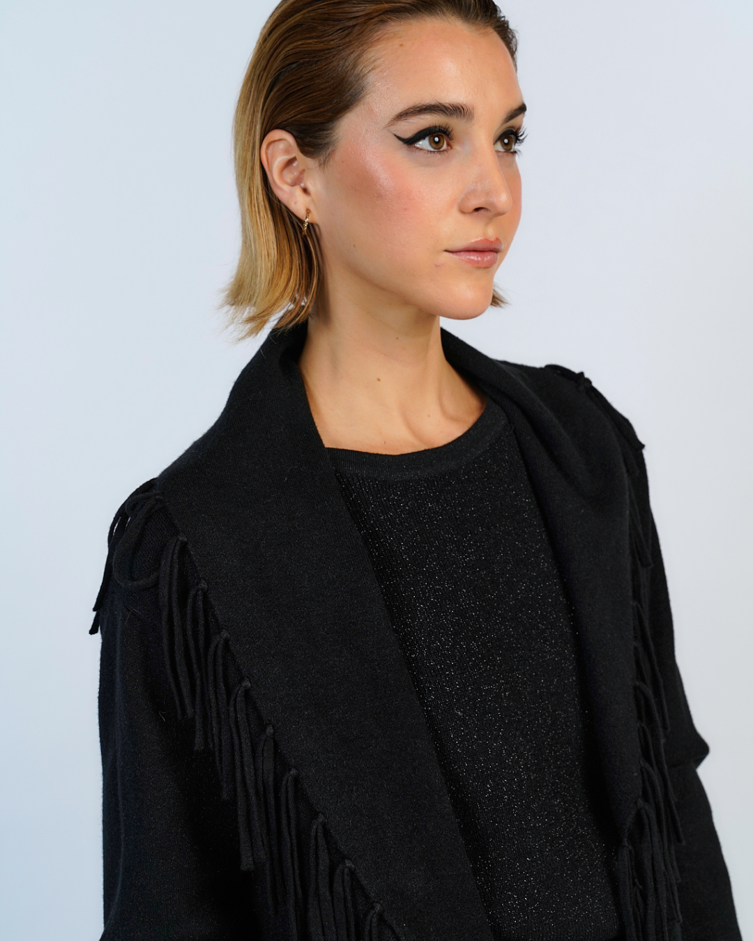 Abrigo de punto estilo cardigan, confeccionado en jersey tejido que le otorga suavidad y confort. Con flecos en los bordes para un toque bohemio y bolsillos grandes que añaden funcionalidad y estilo.