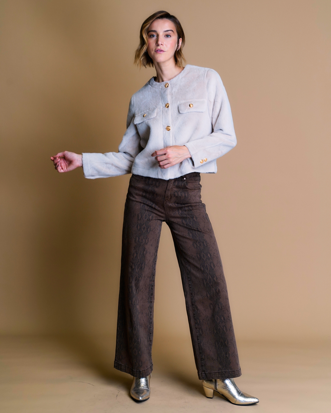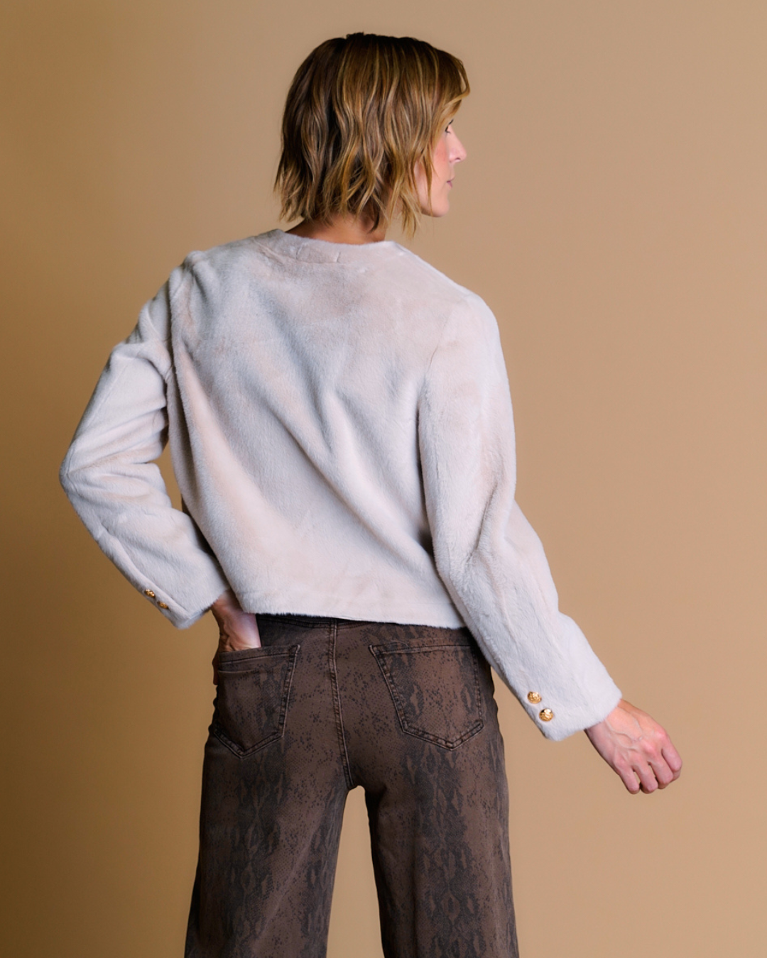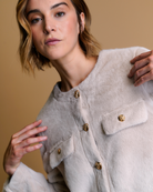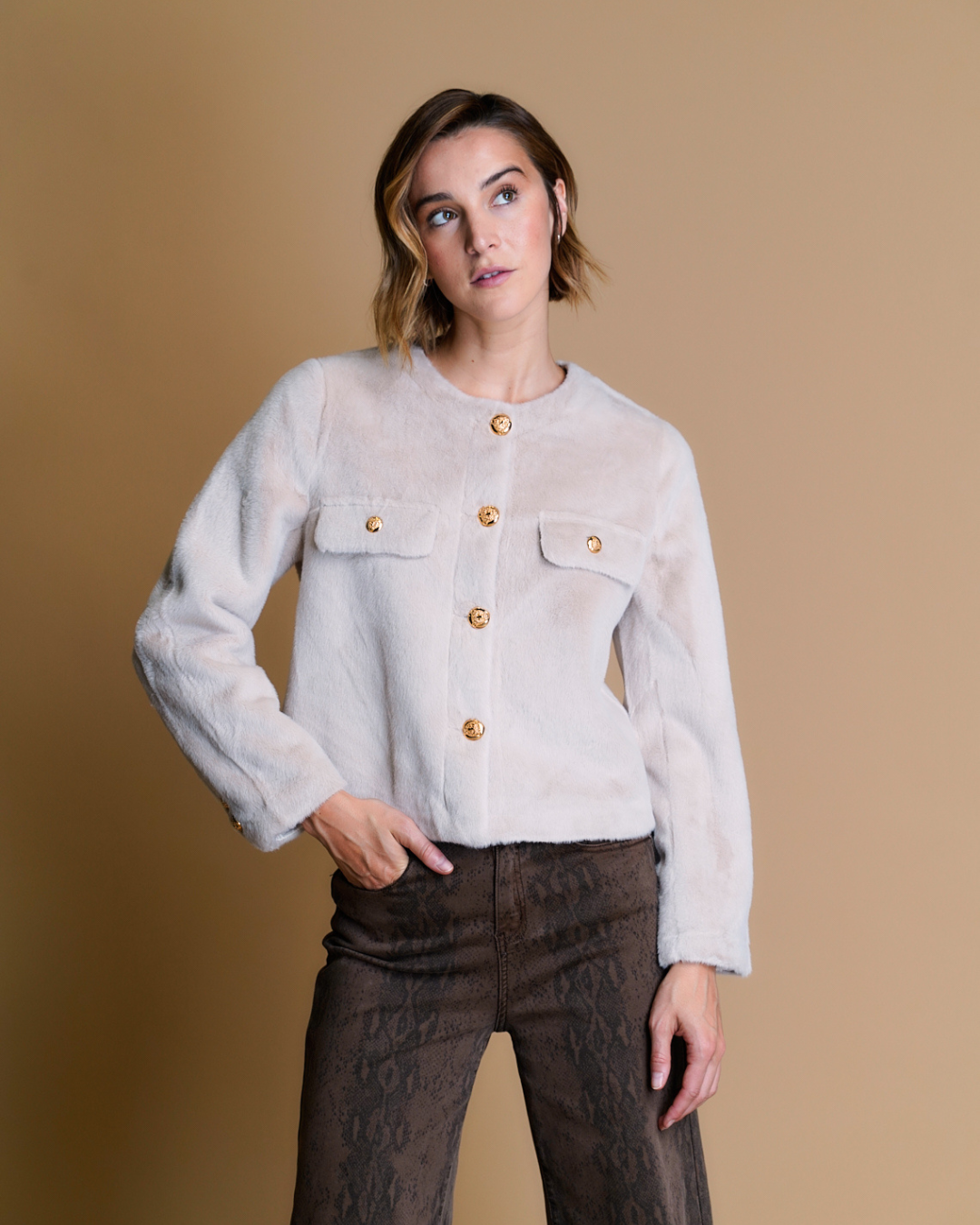 Chaqueta corte Chanel afelpada, de textura suave y envolvente. Su diseño elegante se realza con una botonadura frontal dorada, aportando un toque de sofisticacion clasica y atermporal