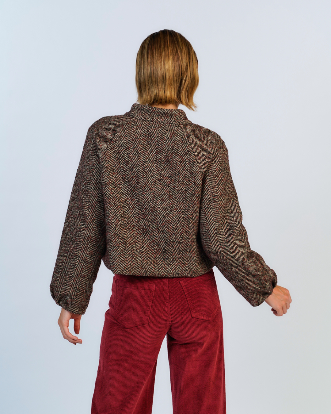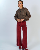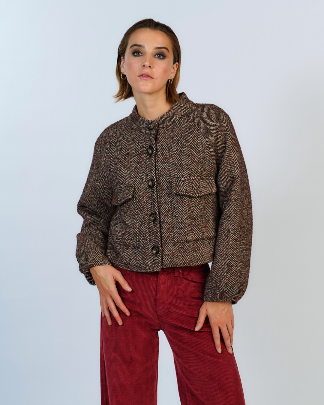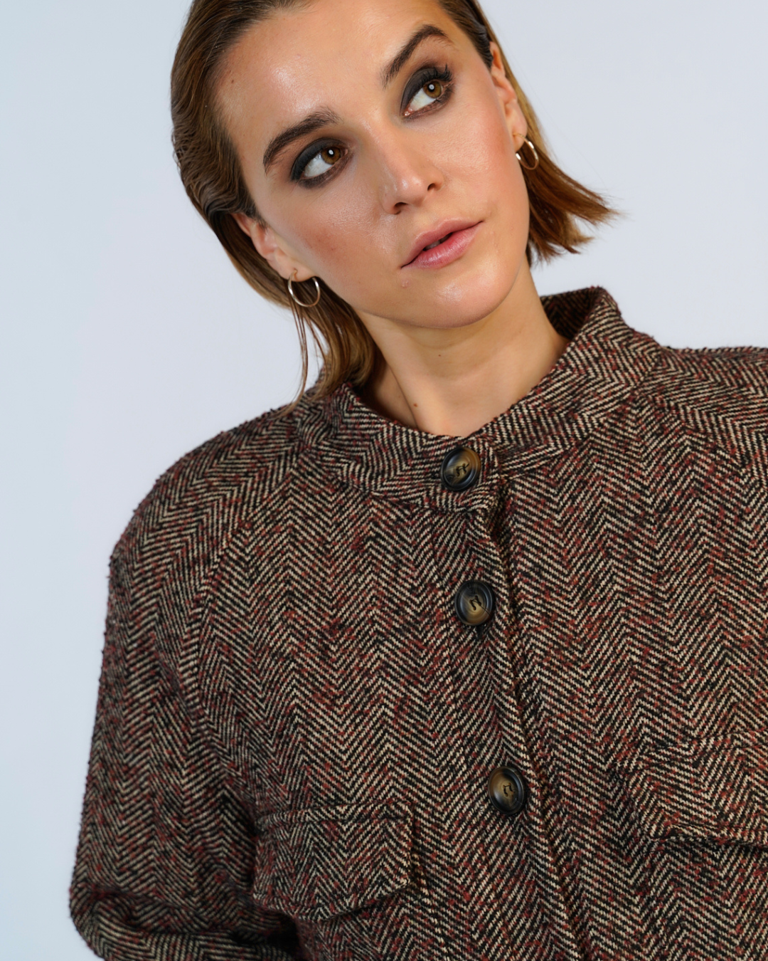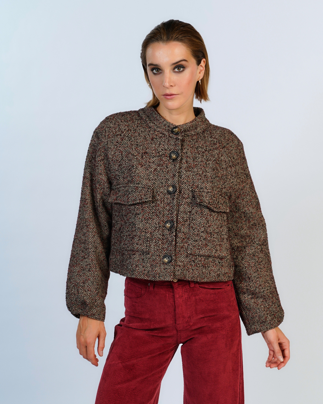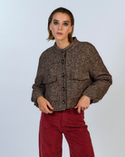 Chaqueta crop en tela tweed espiga, con botonadura frontal, bolsillos espaciosos. El forro de animal print un toque audaz y único a esta prenda clasica