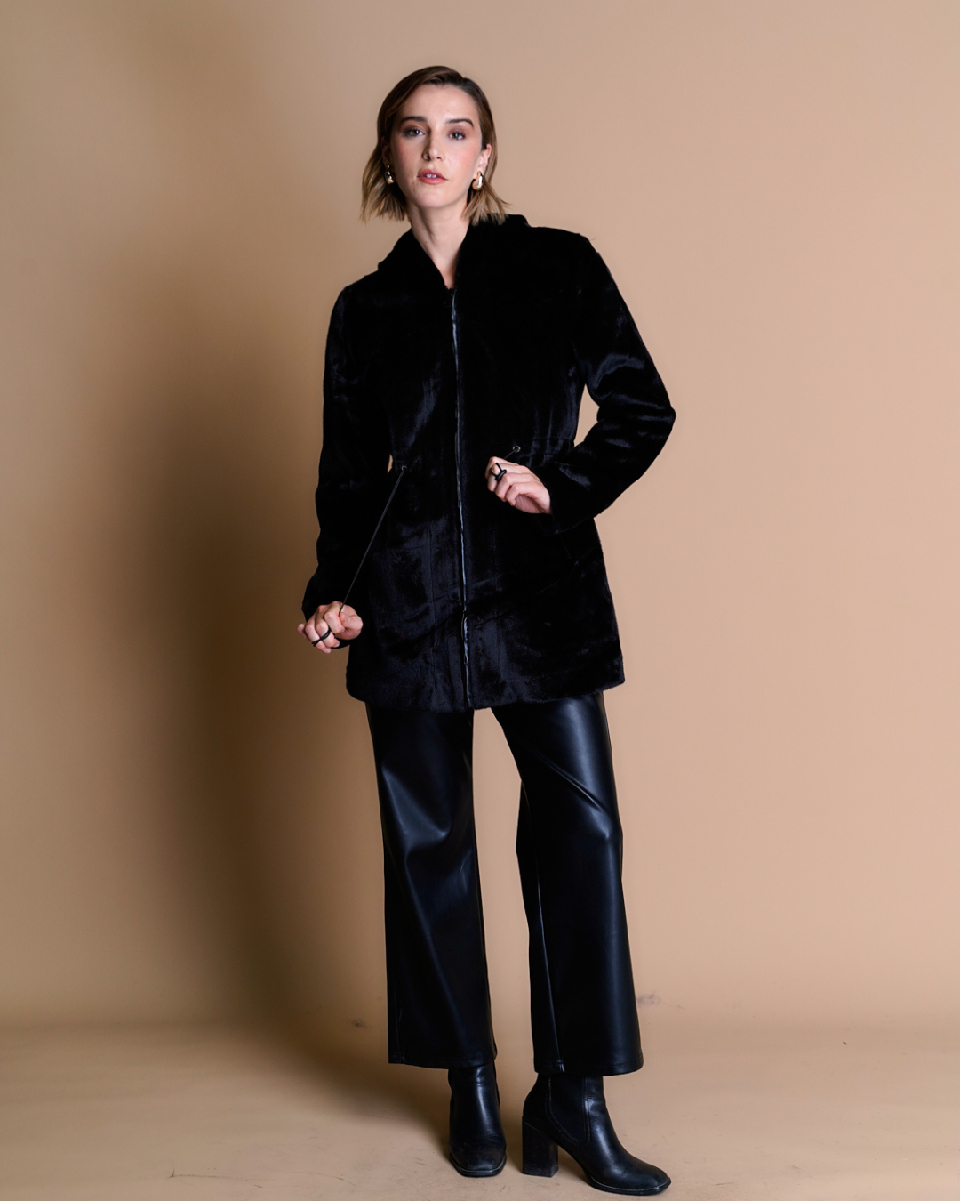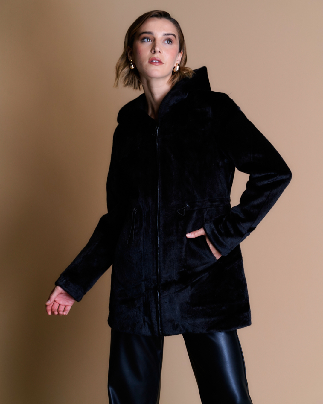 Chaqueta de felpa con un suave efecto aterciopelado, perfecta para el invierno. Su diseño incluye una pretina ajustable en la cintura para un calce cómodo, bolsillos laterales funcionales y una capucha que aporta abrigo