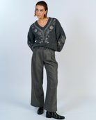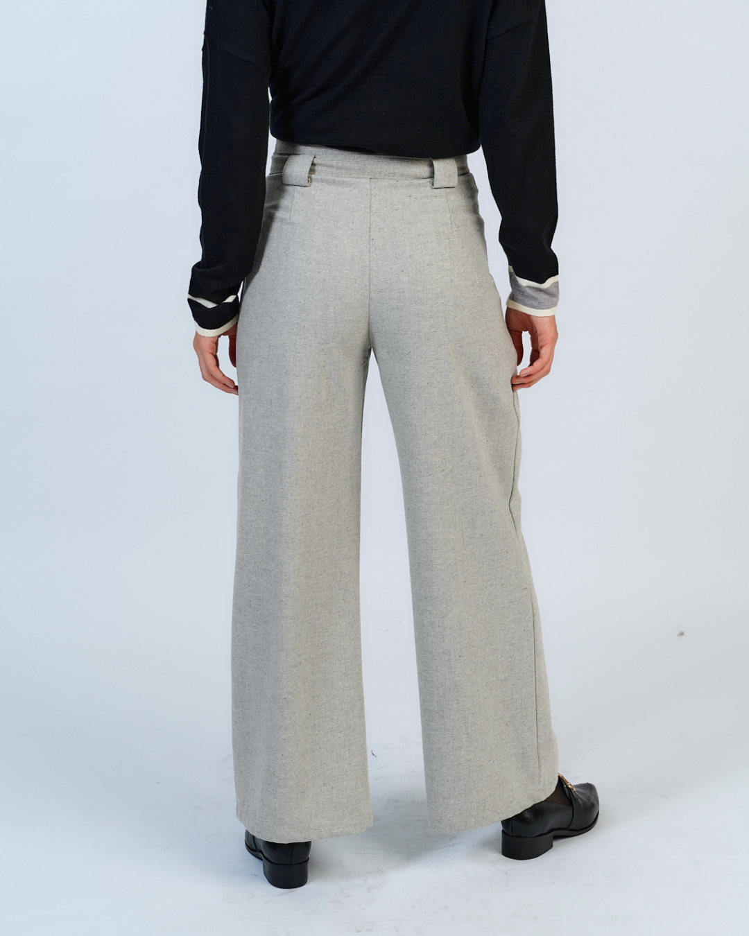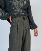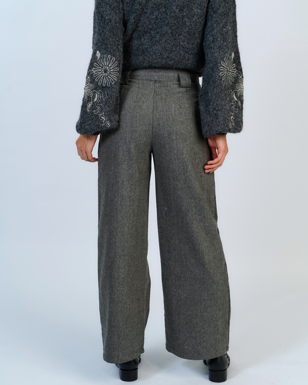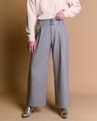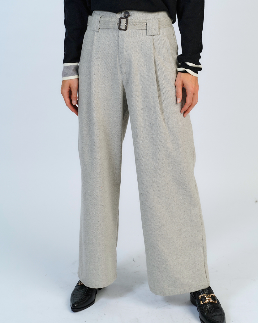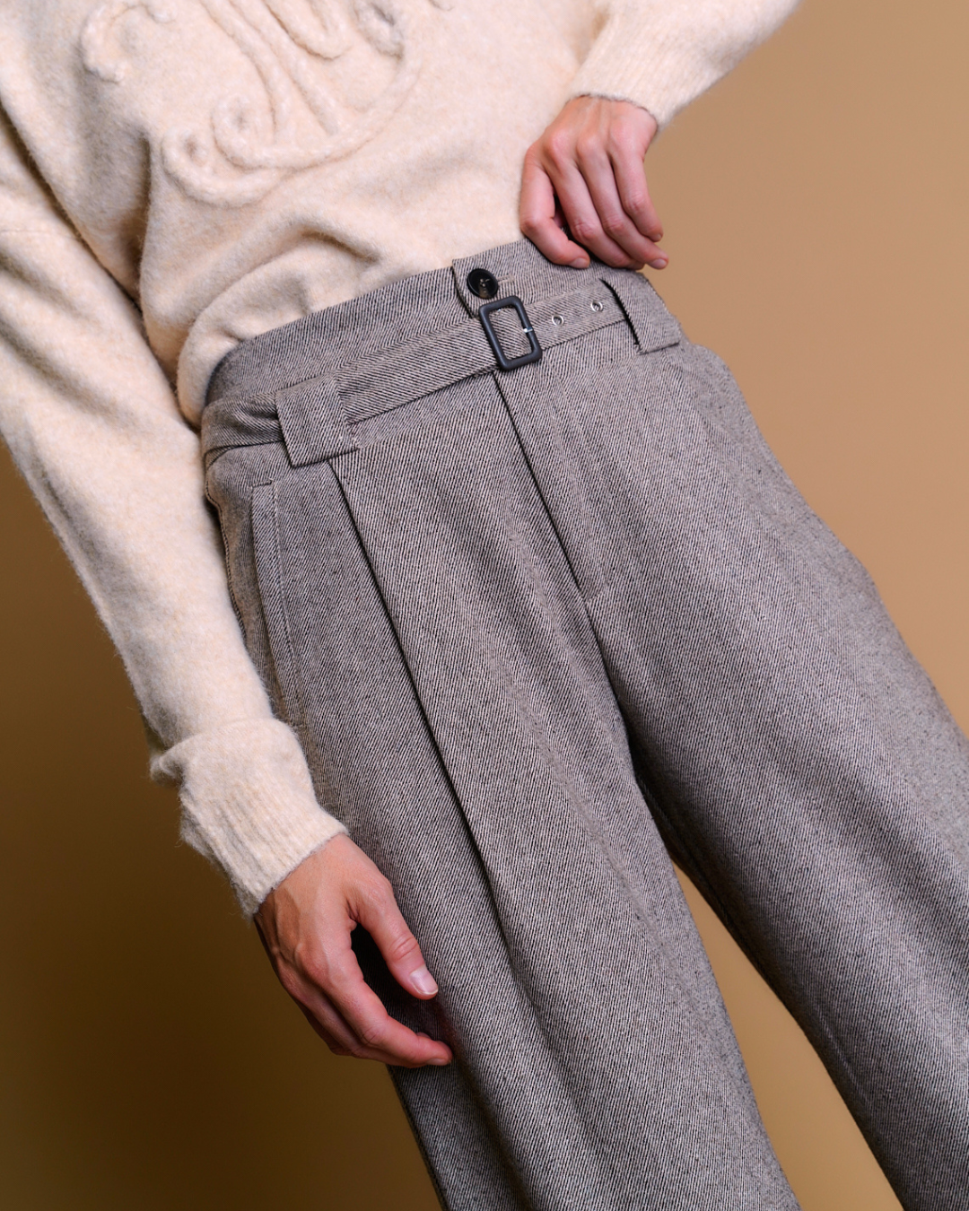 Pantalon de tejido tweed con pinzados, diseño elegante y practico con bolsillos laterales y correa en la cintura, ideal para un look clasico y sofisticado.