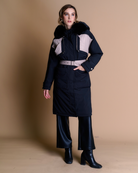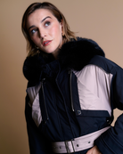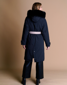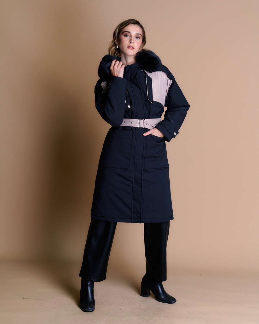 Parka larga de material impermeable, diseño funcional con capucha de pelo sintetico, bolsillos amplios y correa ajustable en la cintura para un mejr ajuste. Cuenta con cierre frontal y abotonadura a presión.