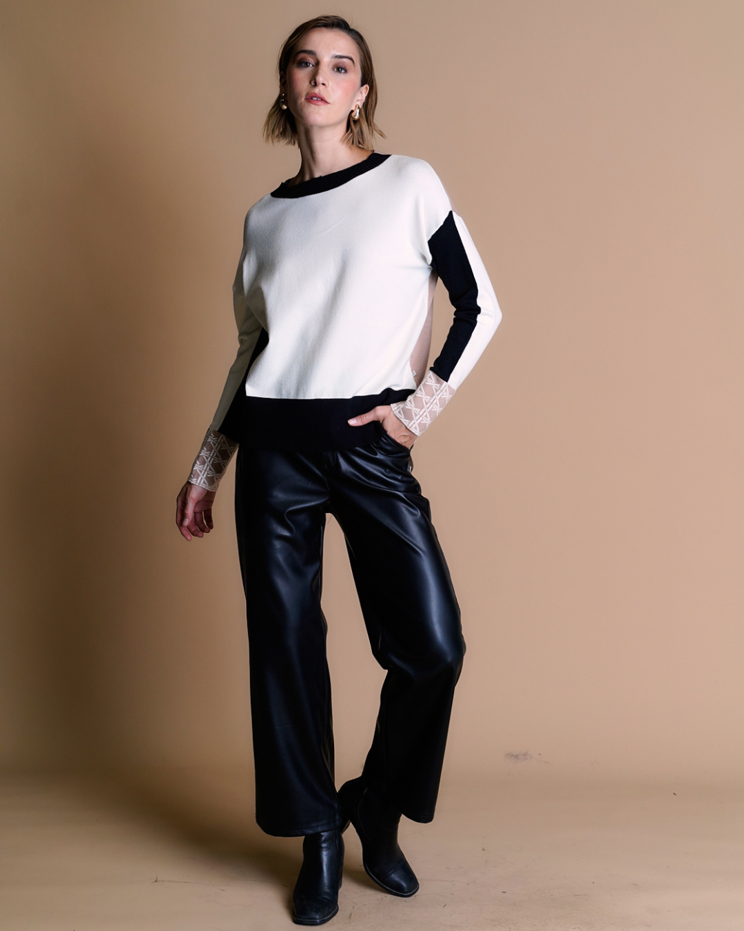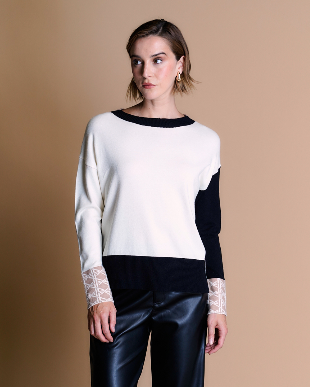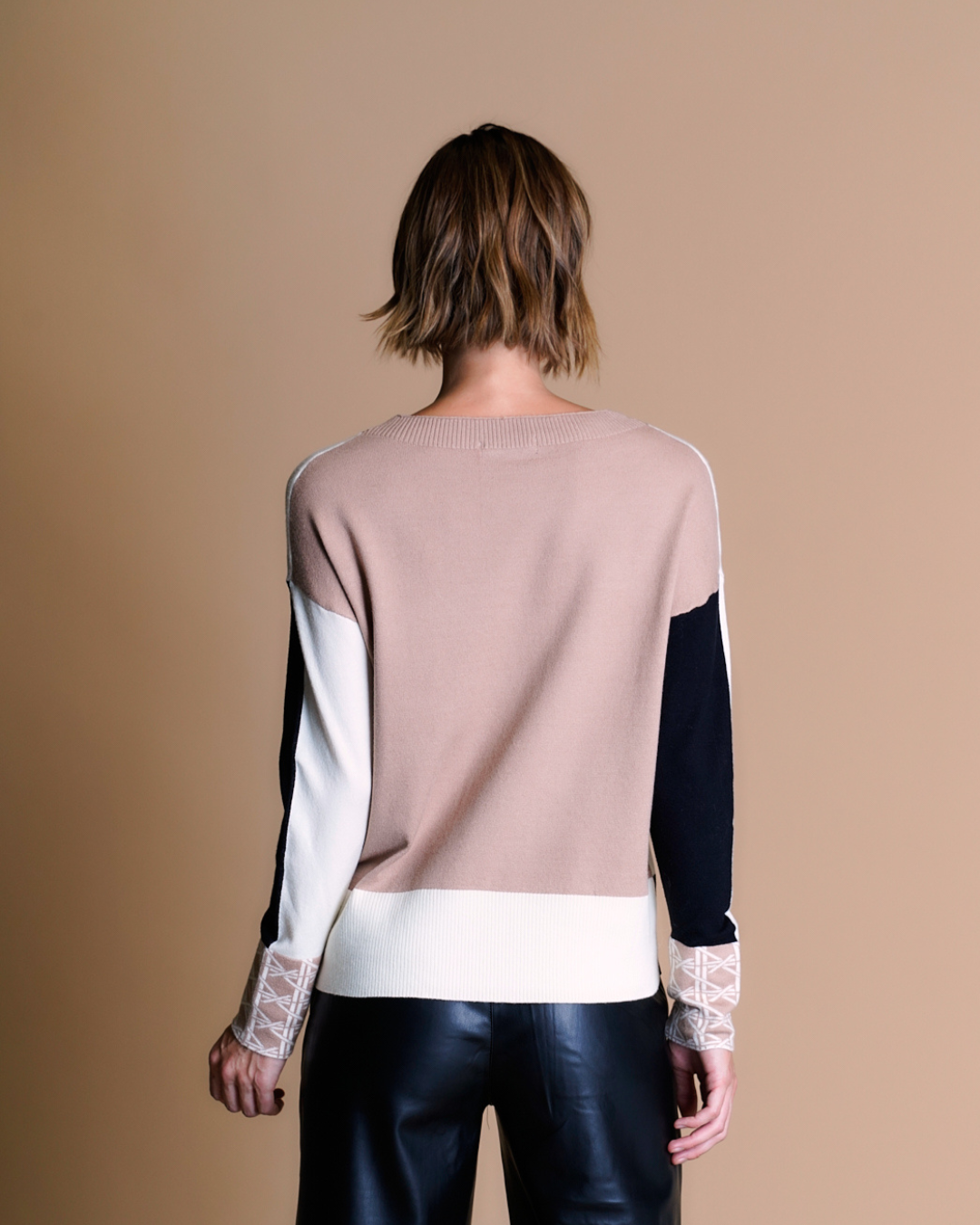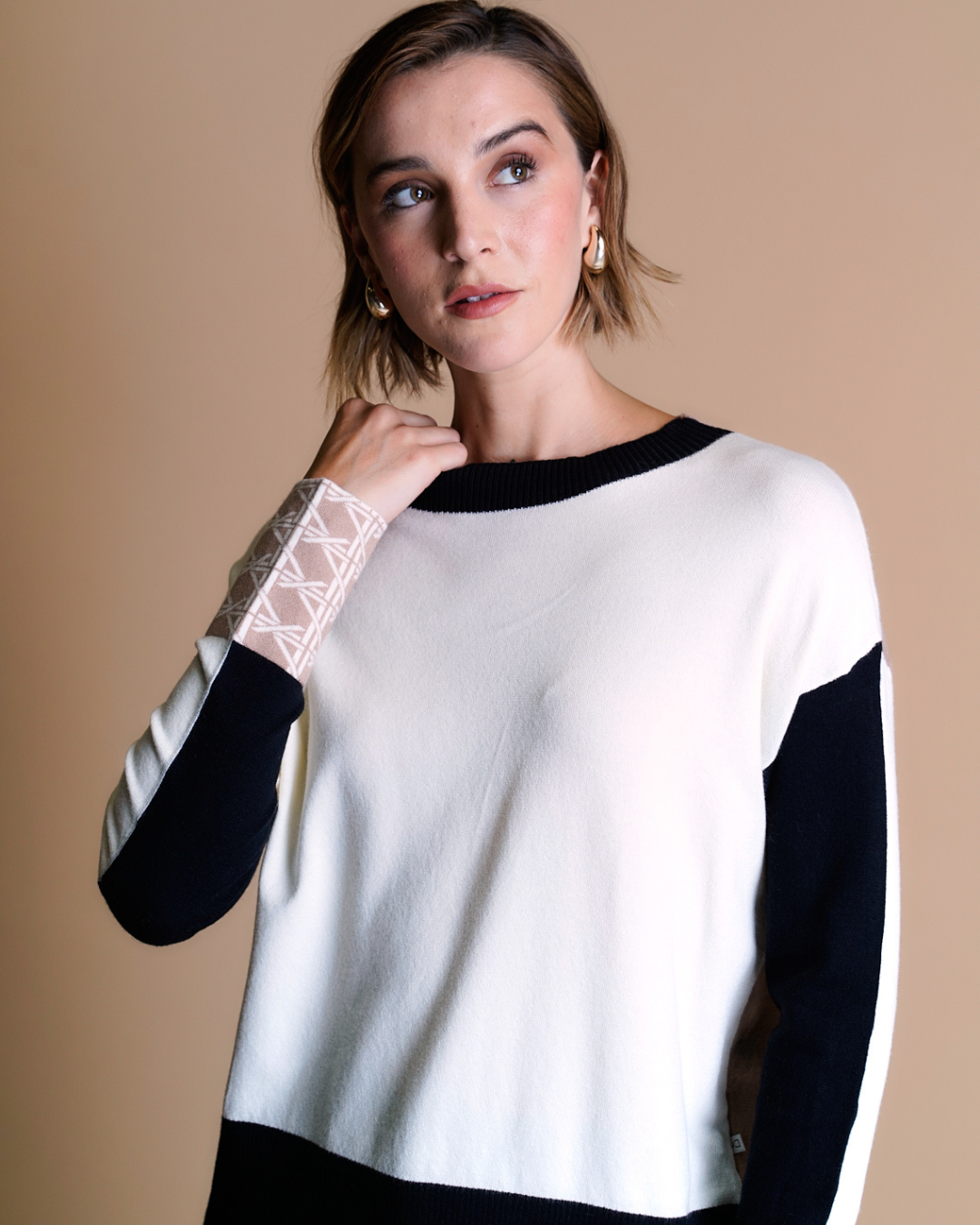 Suéter Barca combinado, confeccionado en tejido jersey bicolor, con un fit holgado que aporta en comodidad y movimiento. su cuello de rib y mangas estampadas añaden contraste y dinamismo, creando una pieza única con un estilo bohemio y relajado.