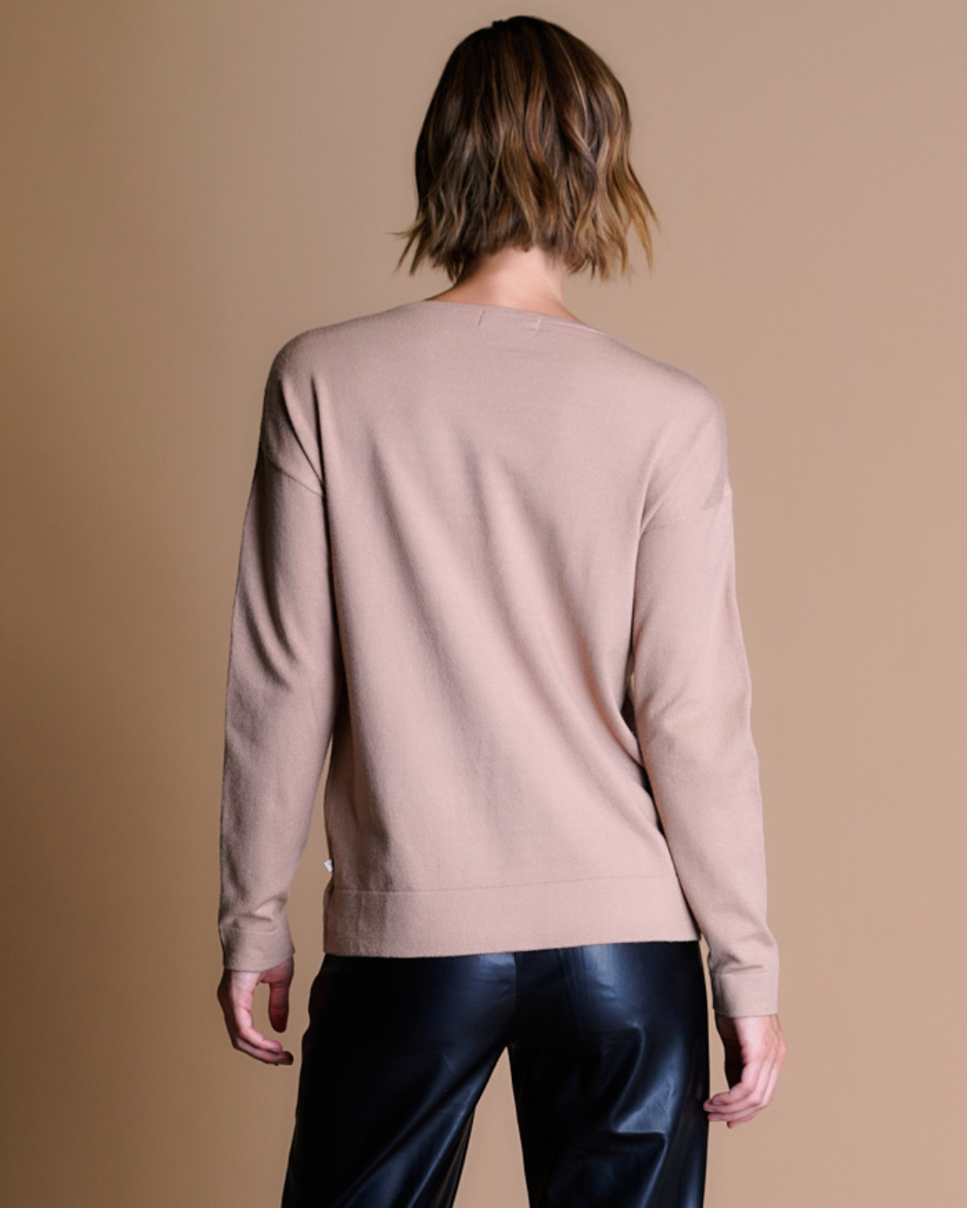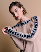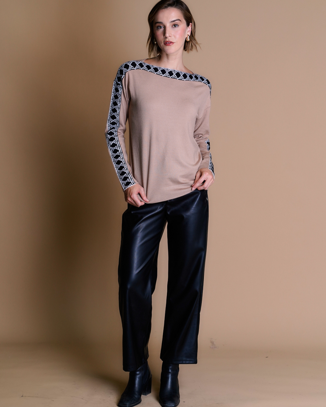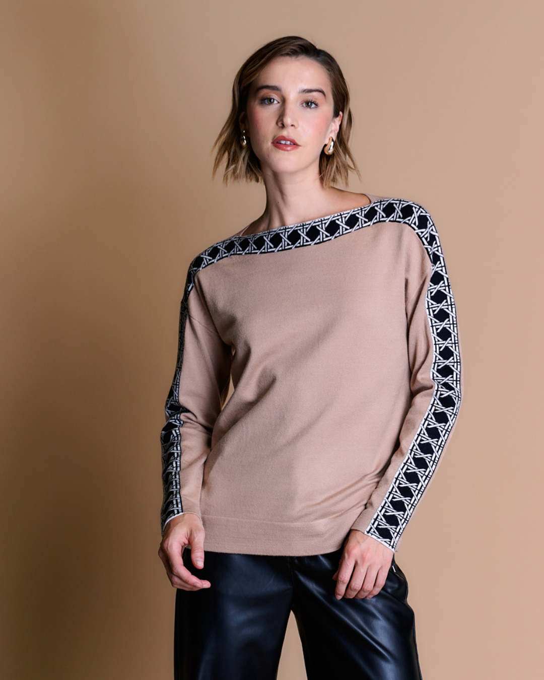 Suéter de jersey con estampado a los costados que recorre toda la prenda, creando un efecto visual dinámico, su estilo sofisticado y relajado gracias a su material suave lo convierte en una opción versátil, combinando comodidad con un toque de elegancia discreta.