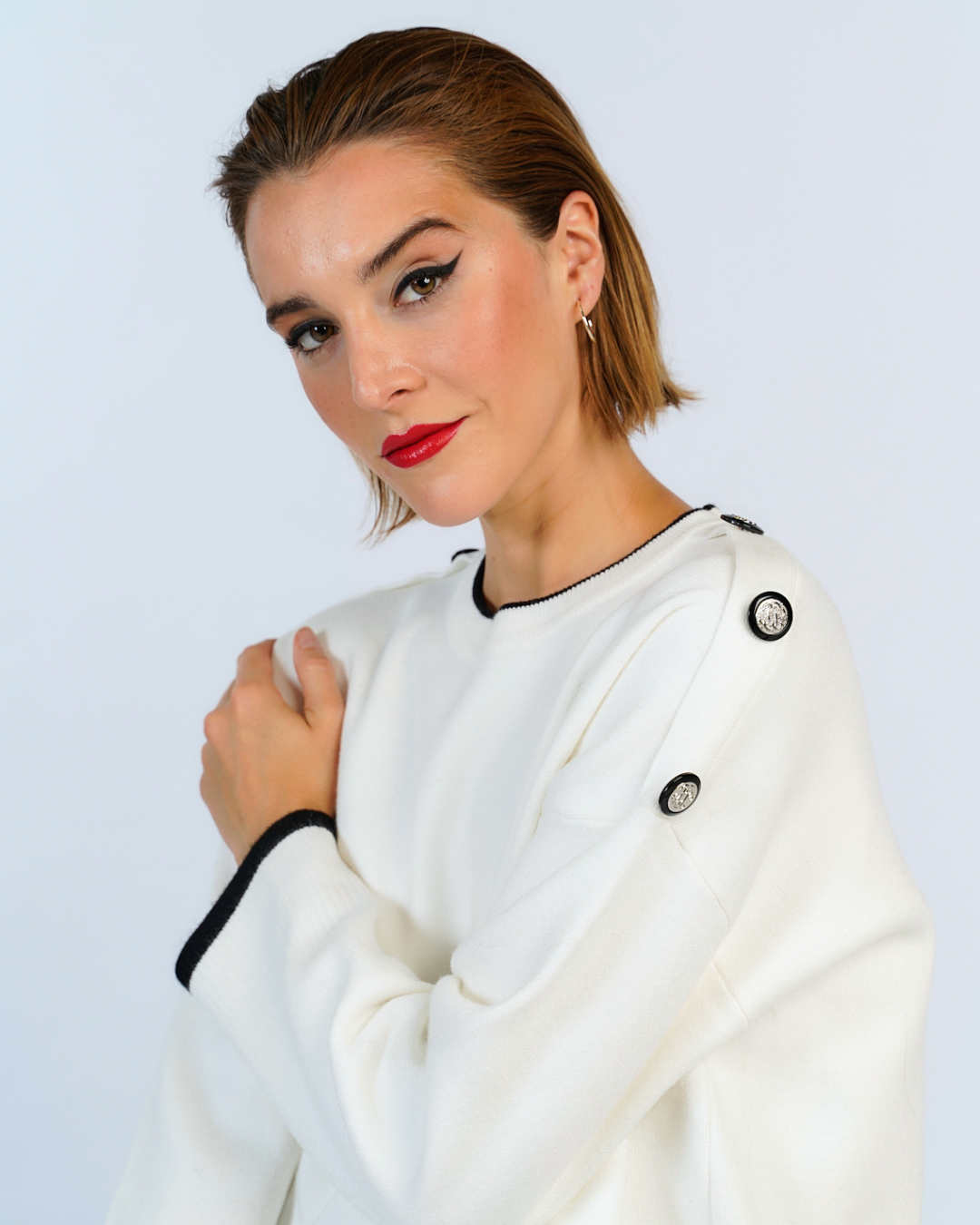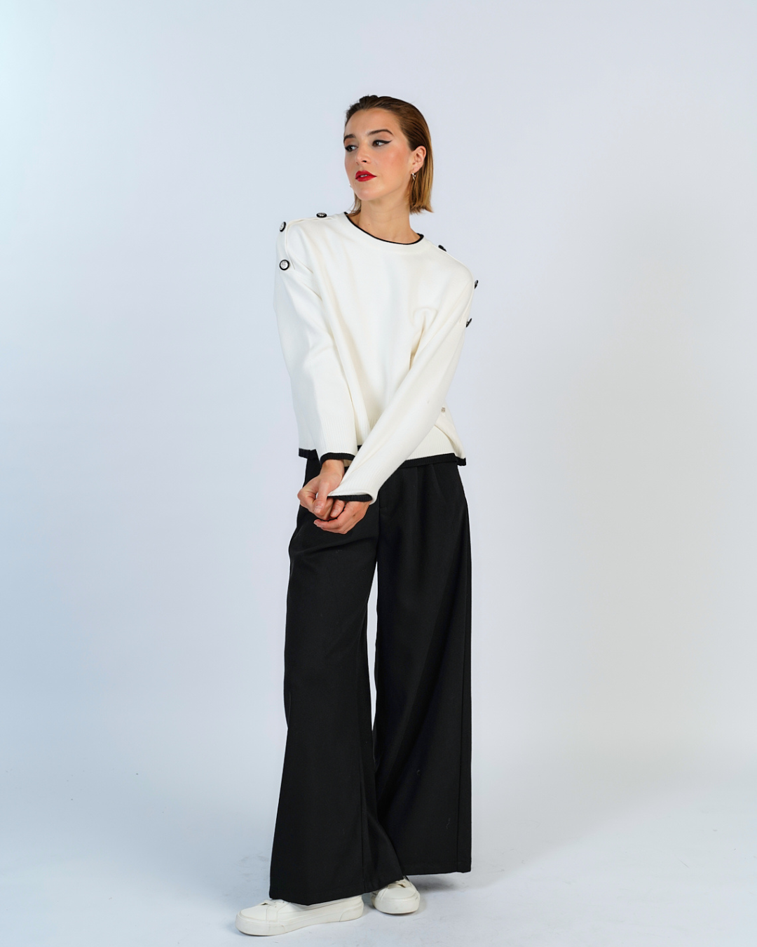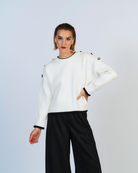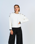 Sueter de tejido jersey con bordes en contraste, posee botones decorativoa en los hombros.