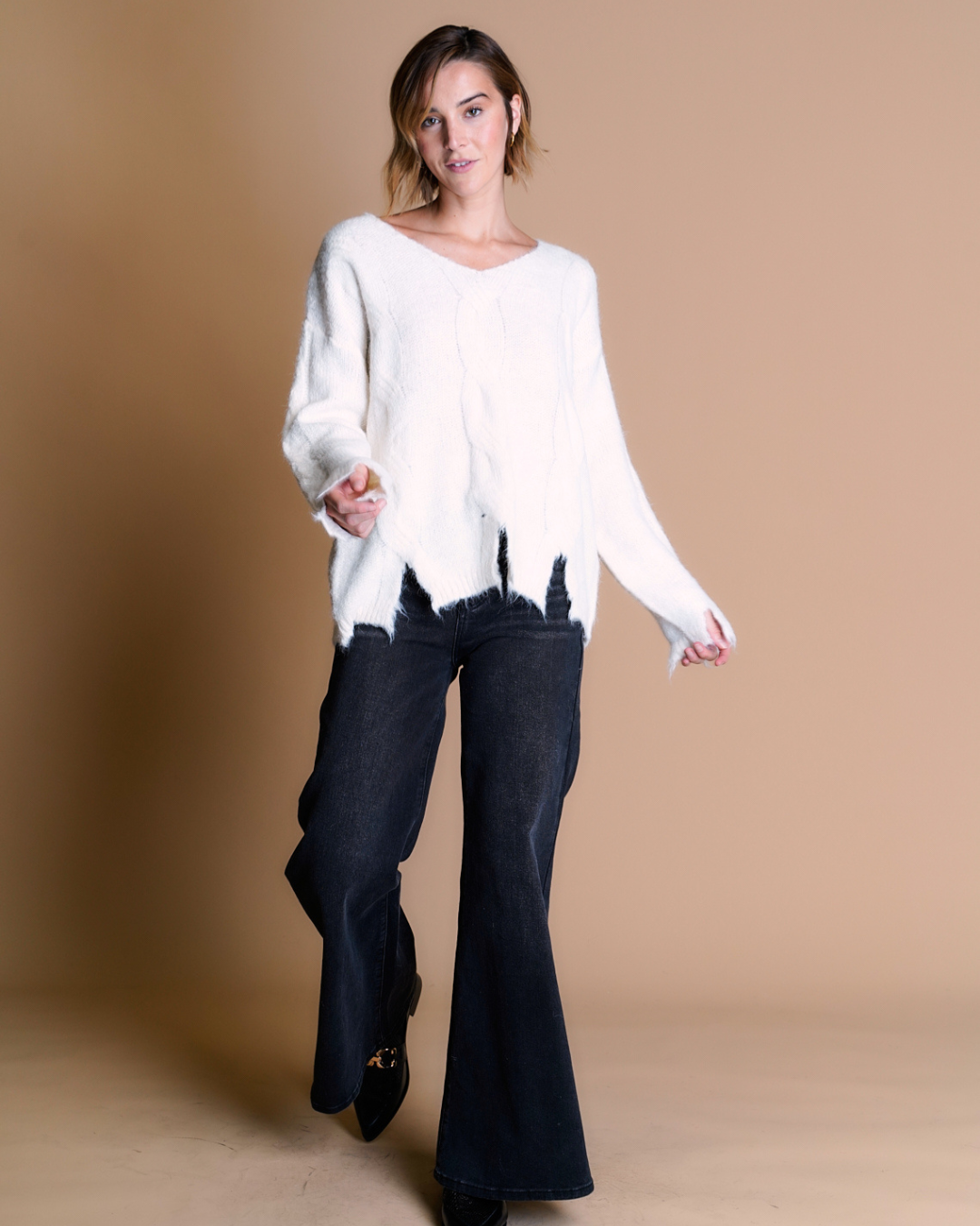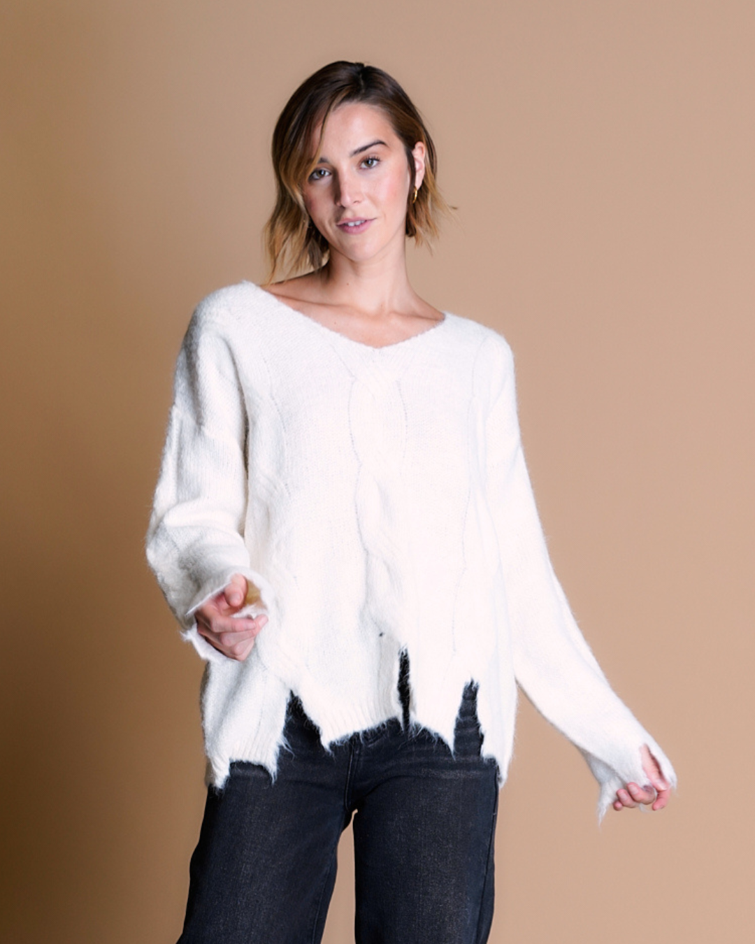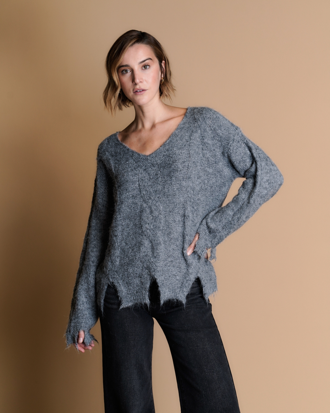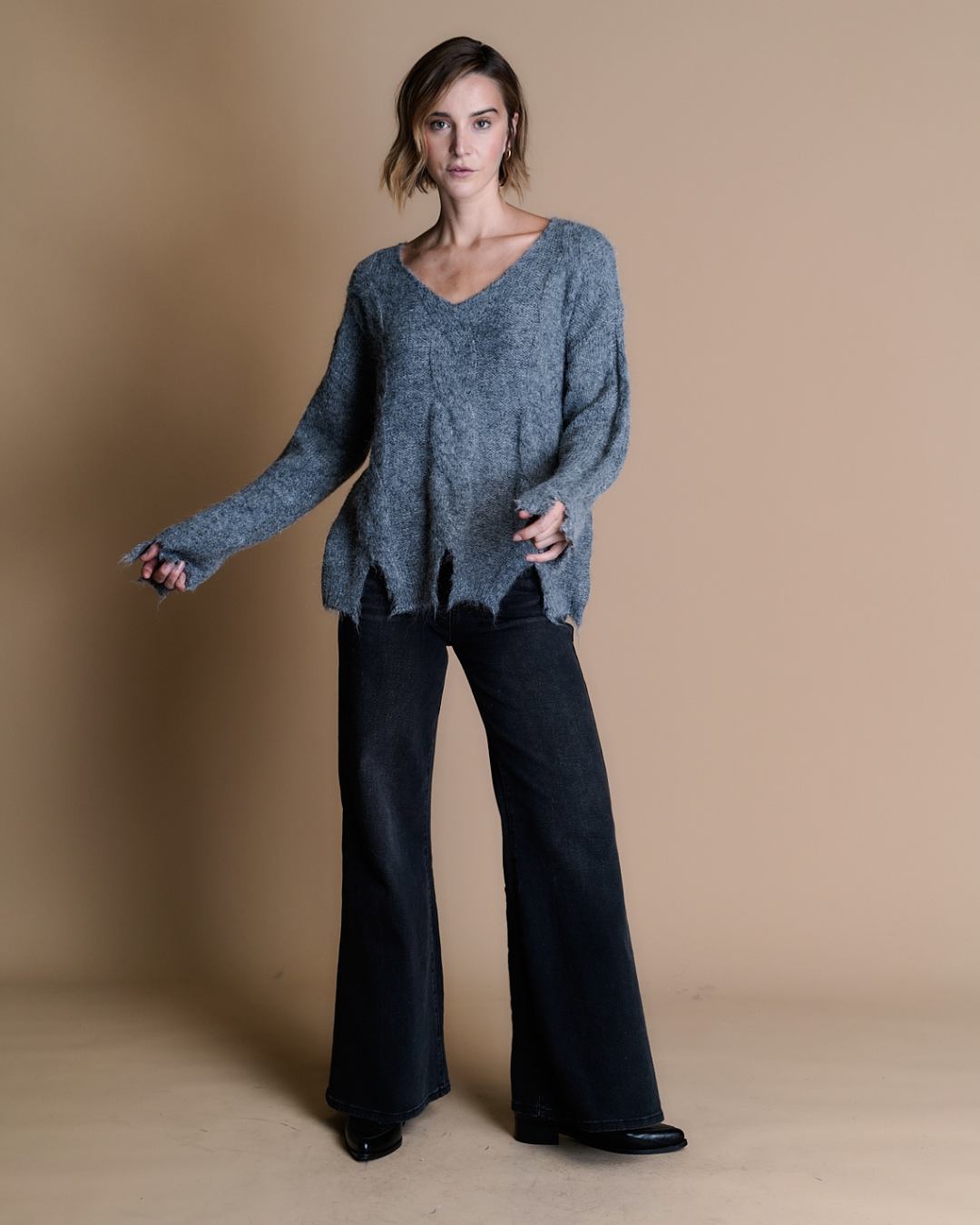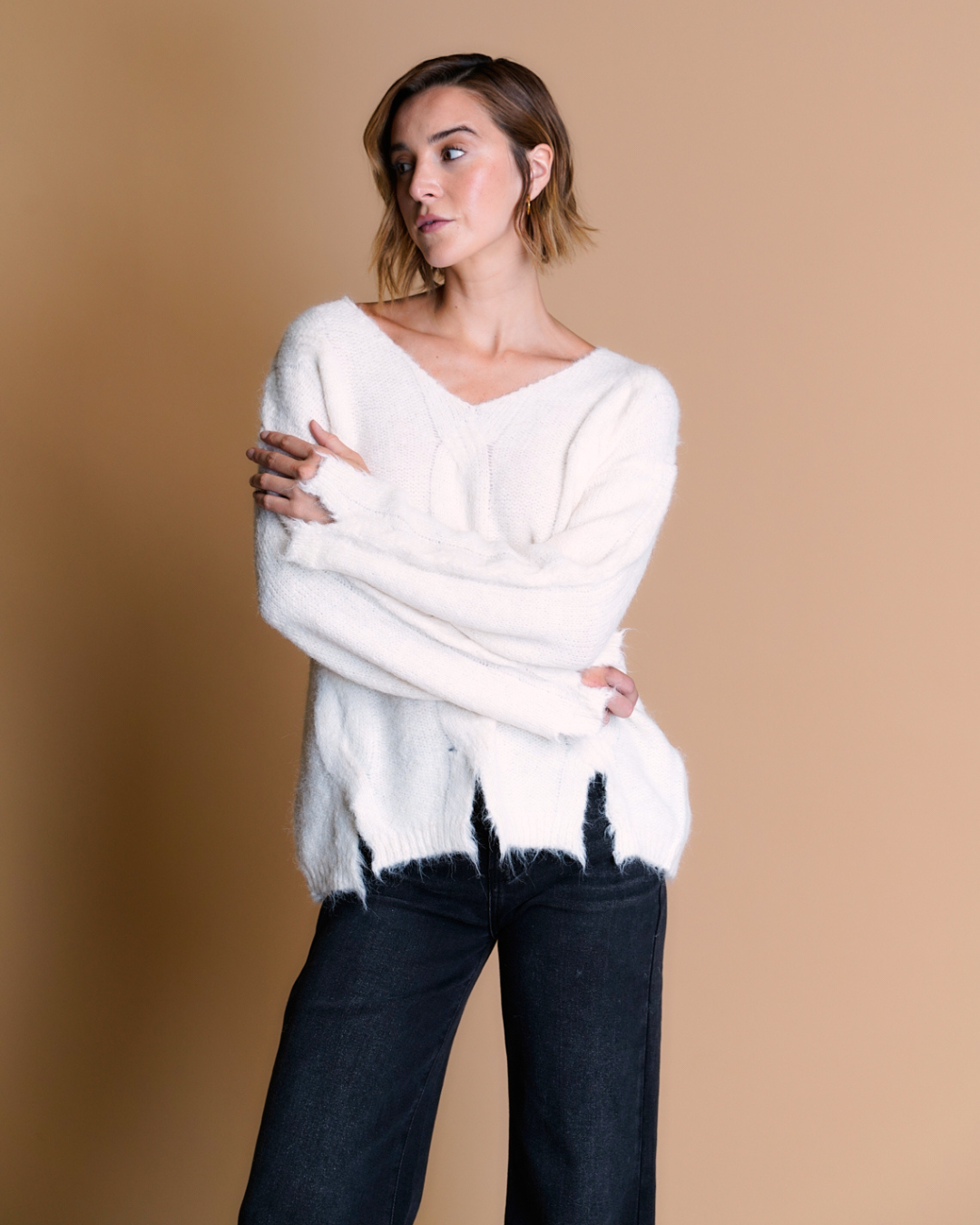 Suéter tejido e V mohair con diseño rasgado en la parte inferior, tejido suave, ligero y cálido. Estilo desenfadado y bohemio, perfecto para looks relajados con un toque distintivo