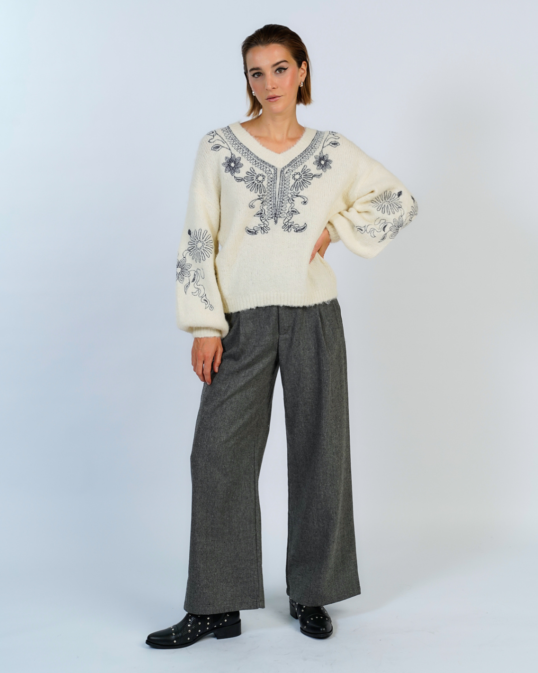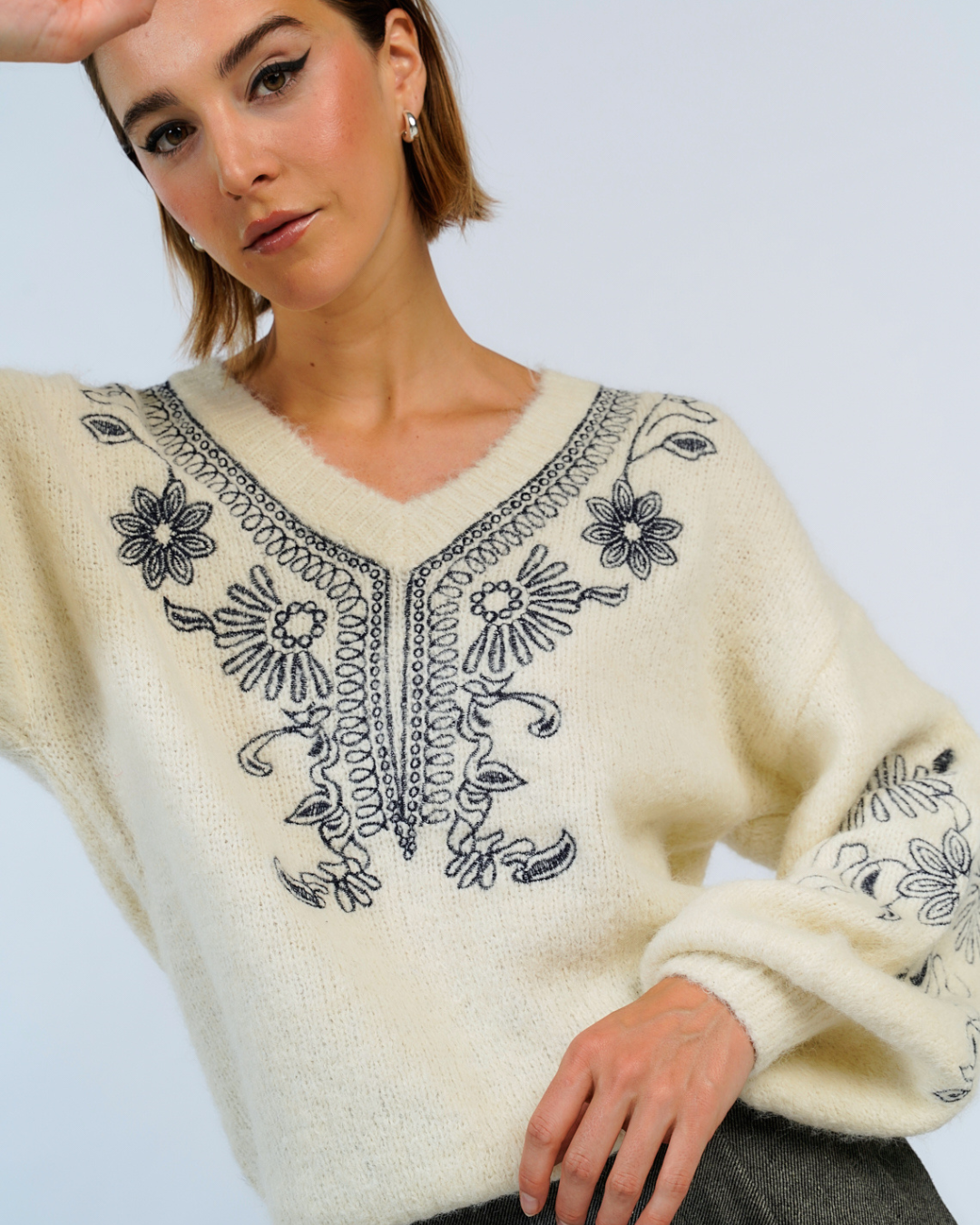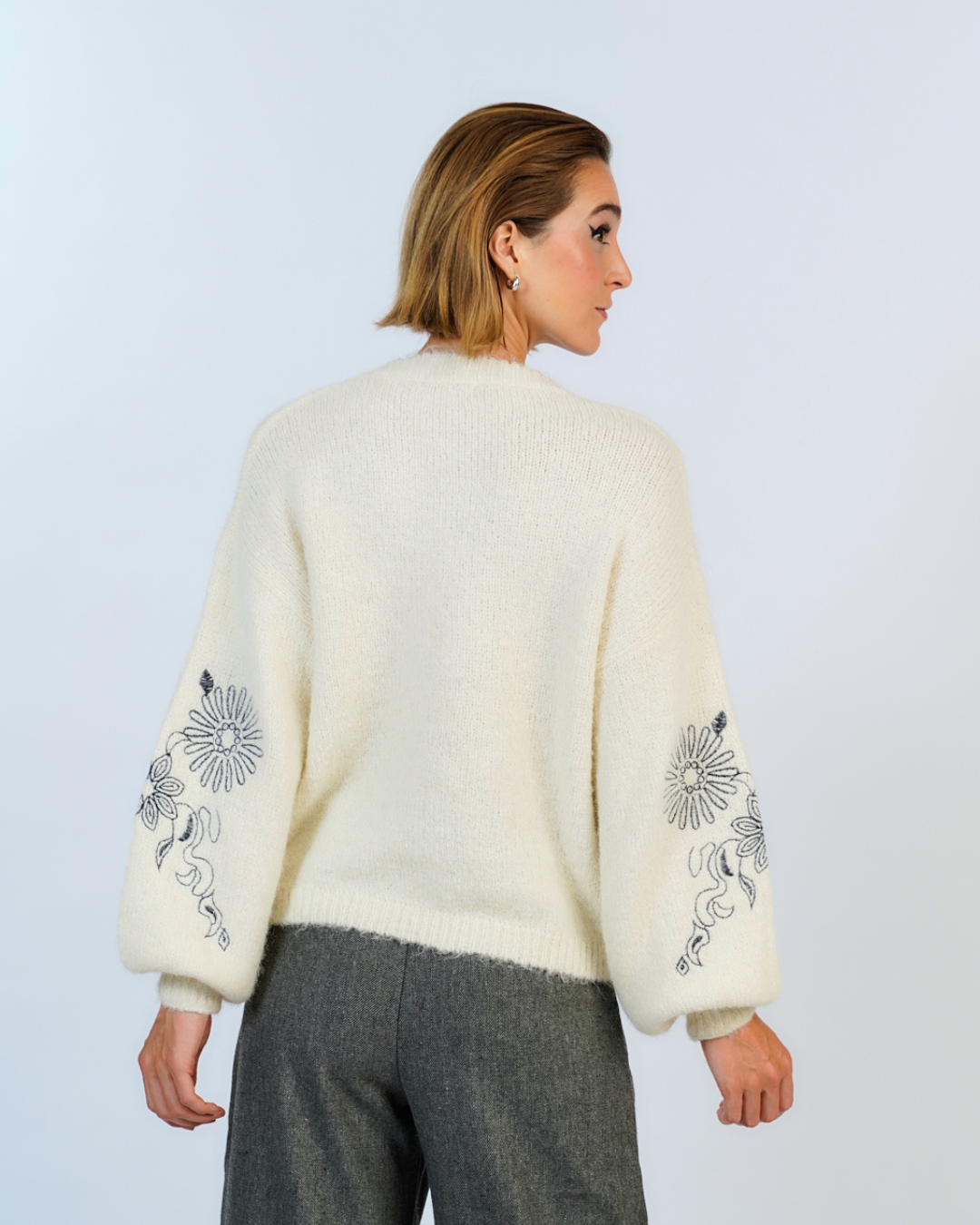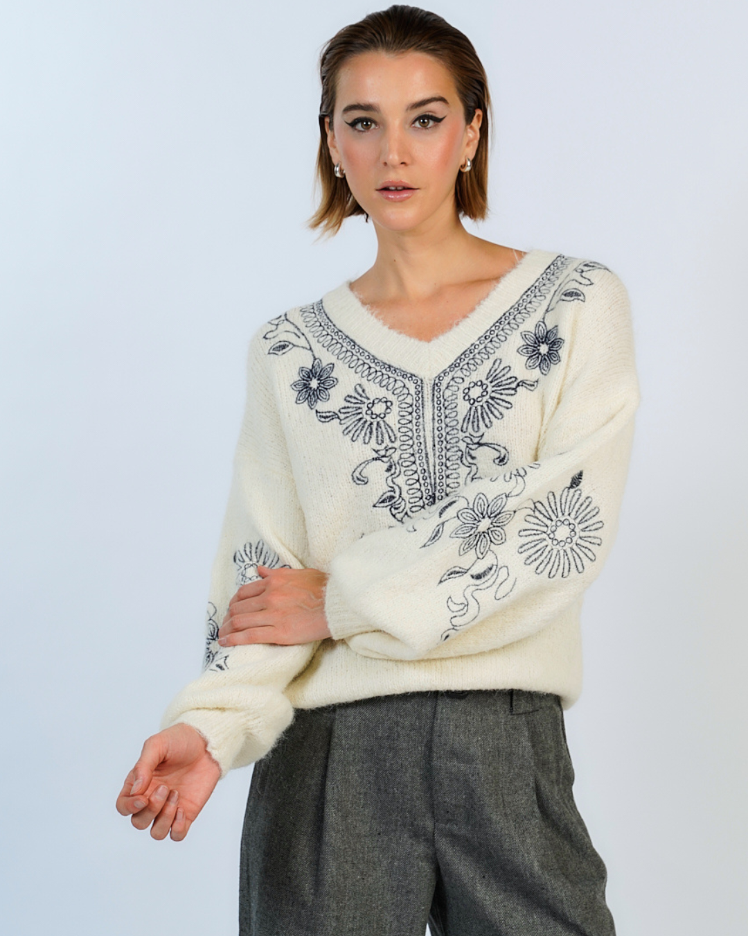 Suéter mohair grueso y suave con cuello en V, una prenda cálida y acogedora. Destaca por sus delicados bordados florales en las mangas y en la parte frontal, agregando un toque romántico y detallado al diseño. Perfecto para un estilo bohemio y femenino.