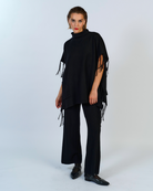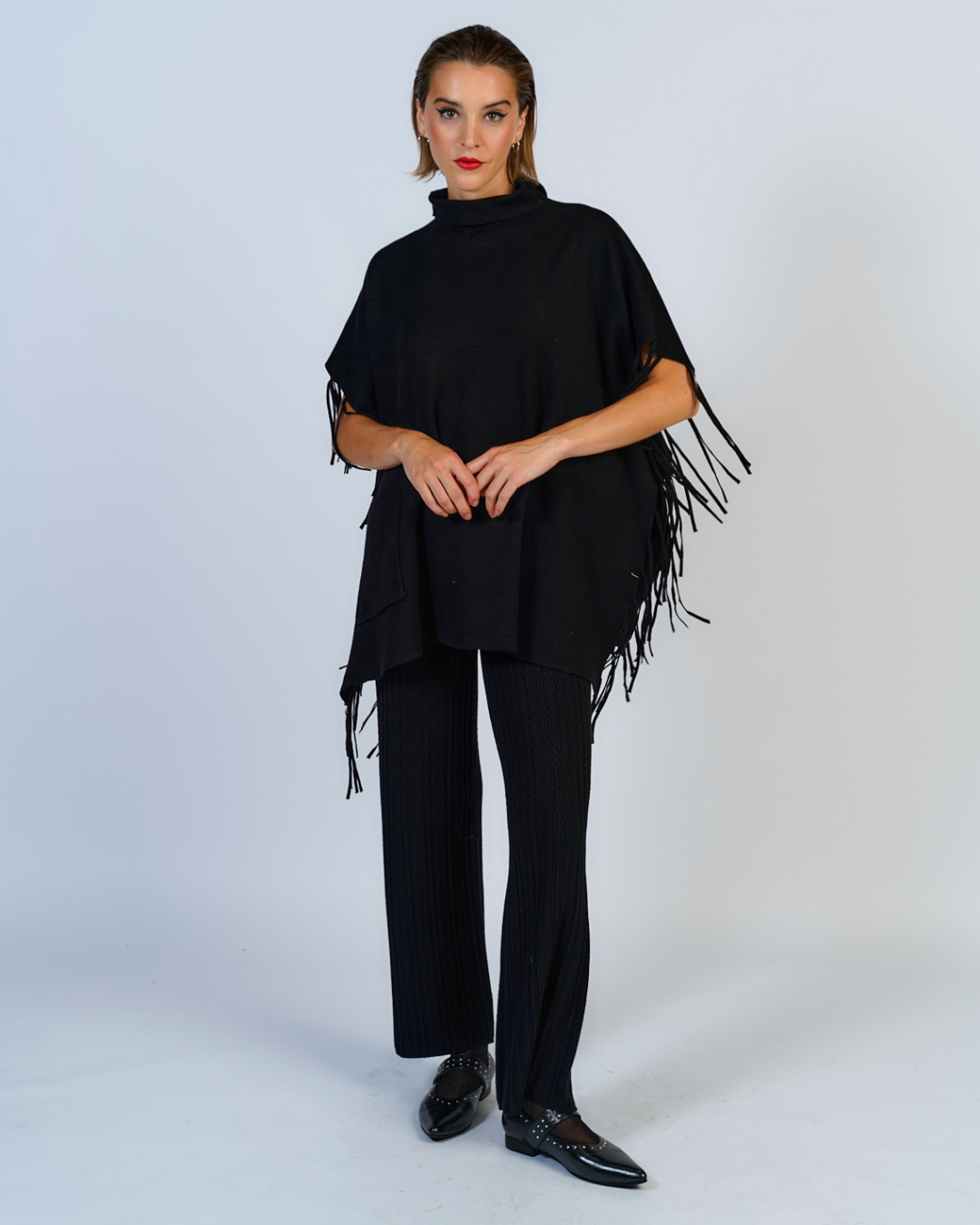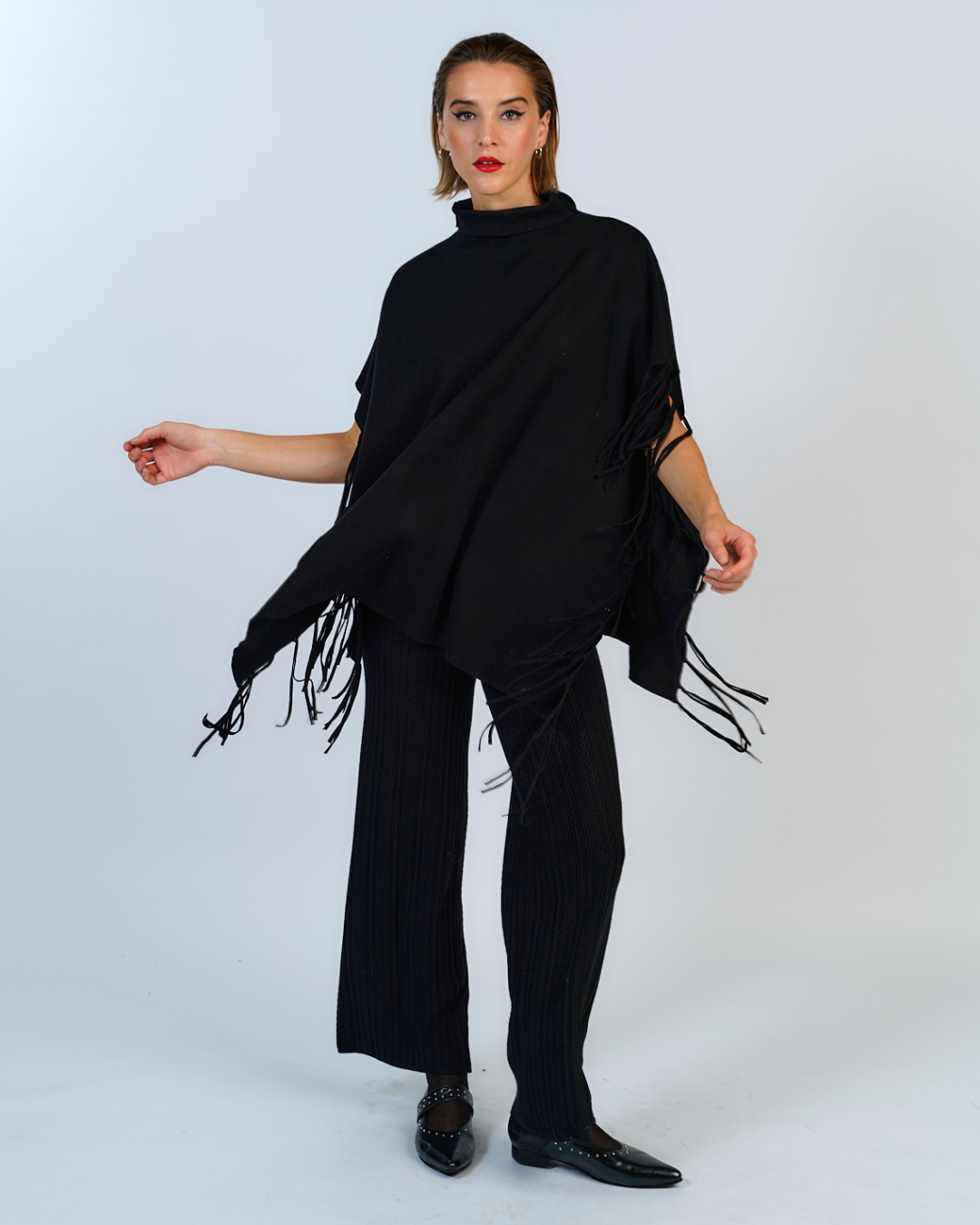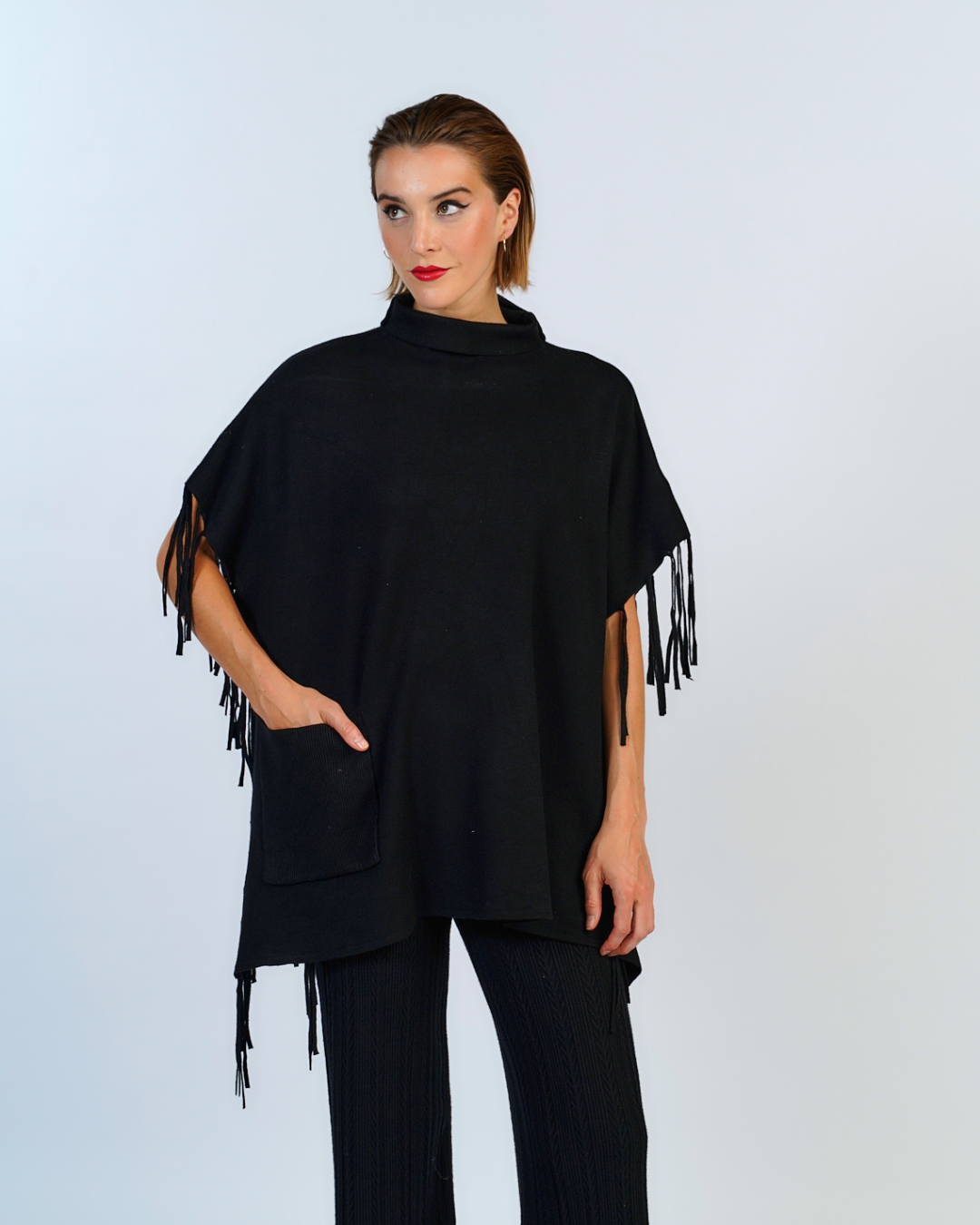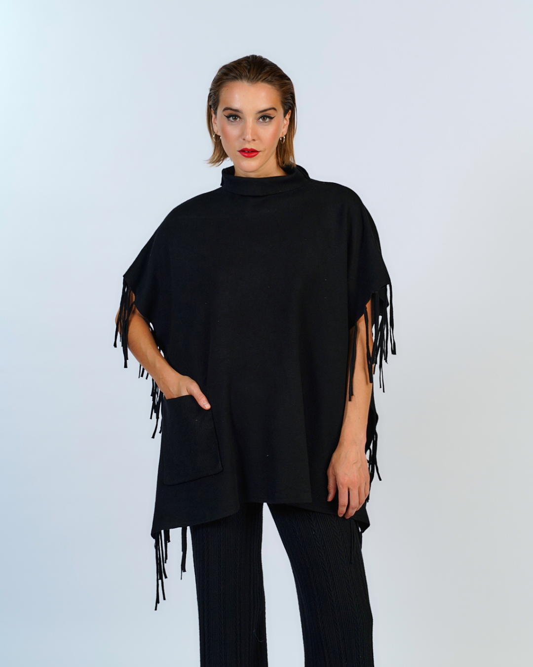 Poncho con flecos Tasca, un tapado de cuello de tortuga confeccionado en jersey suave y cálido, ideal para los dias más frescos. Su diseño fluido incorpora flecos en los costados, aportando movimiento y un aire bohemio. Demás cuenta con un bolsillo profundo, perfecto para comodidad y funcionalidad.