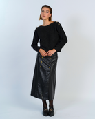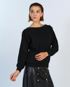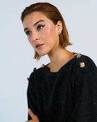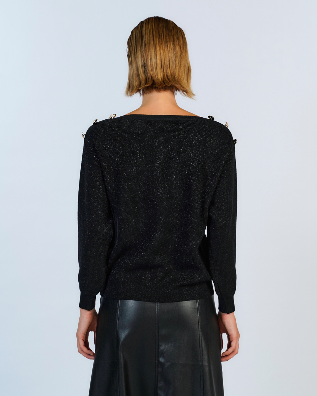 Sueter Lame Botone, confeccionado en tejido canale lame, con un sutil efecto brillante que aporta un toque elegante y distintivo. Su diseño incluye abotonadura en los hombros a modo de adorno, añadiendo un detsalle sofisticado, con un fit comodo y versatil