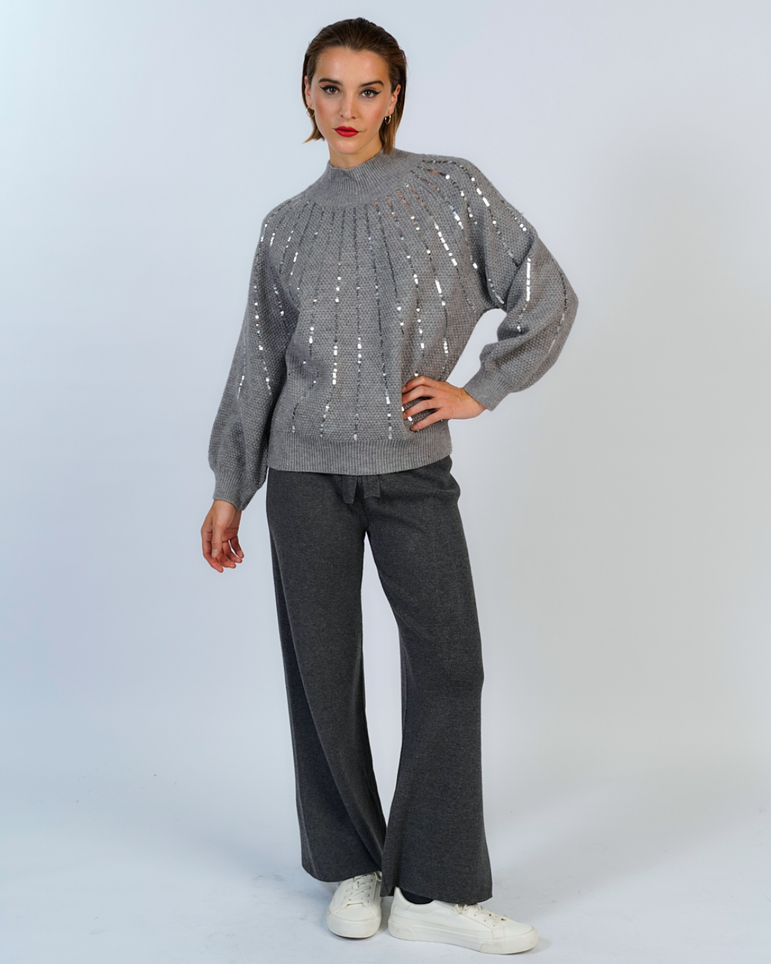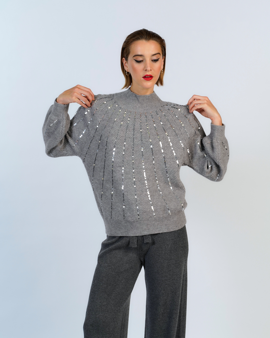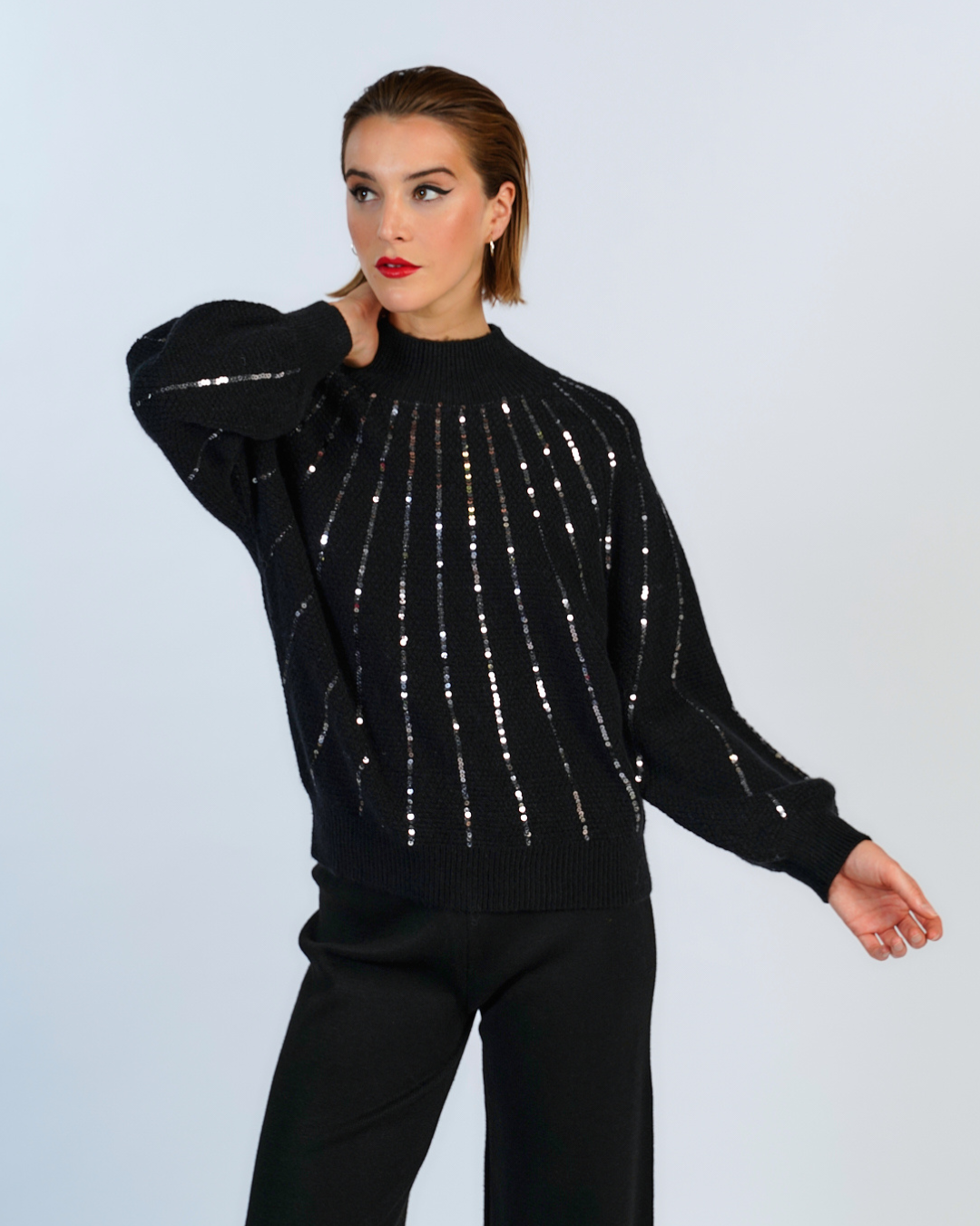 sueter tejido canale, con efecto acanalado en e cuello, confecionado en un material grueso y abrigador. Su diseño esta adornado con lentejuelas que caen suavemente sobre toda la prenda.