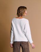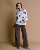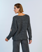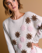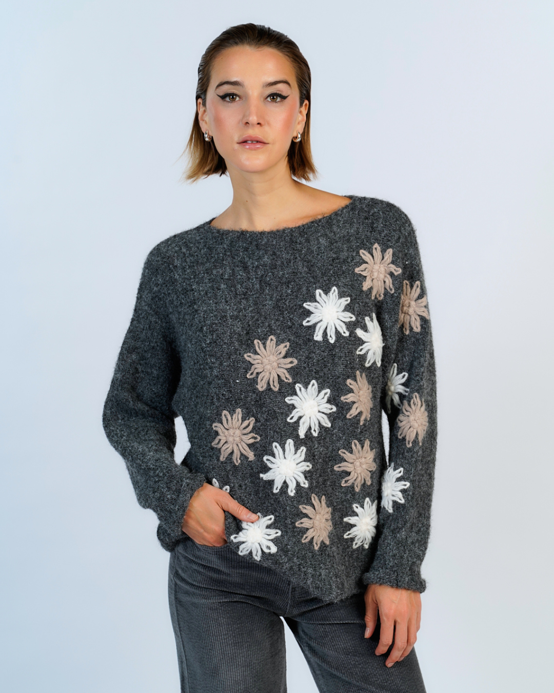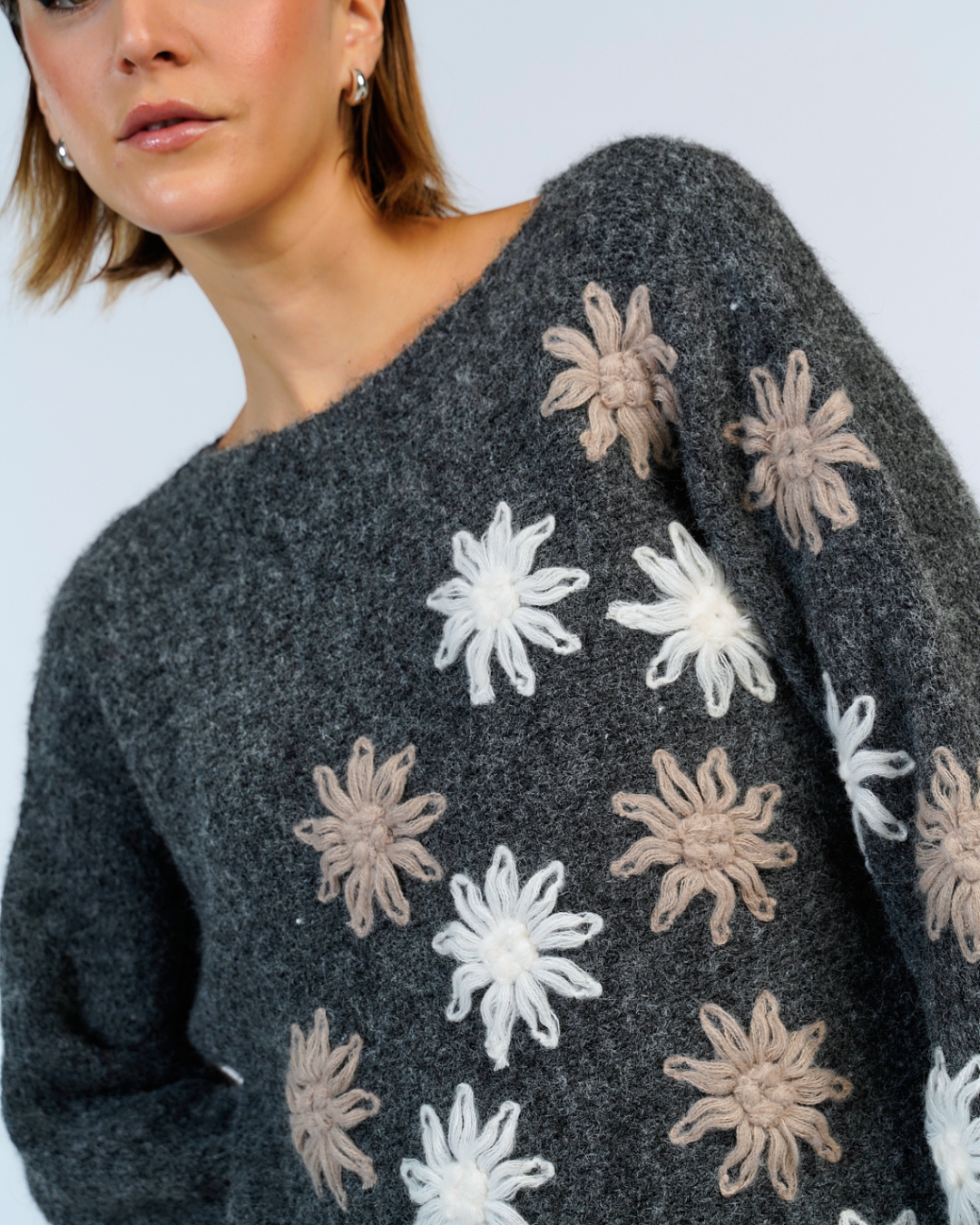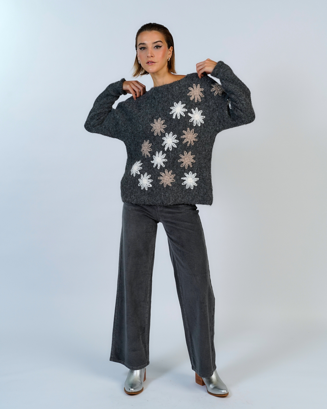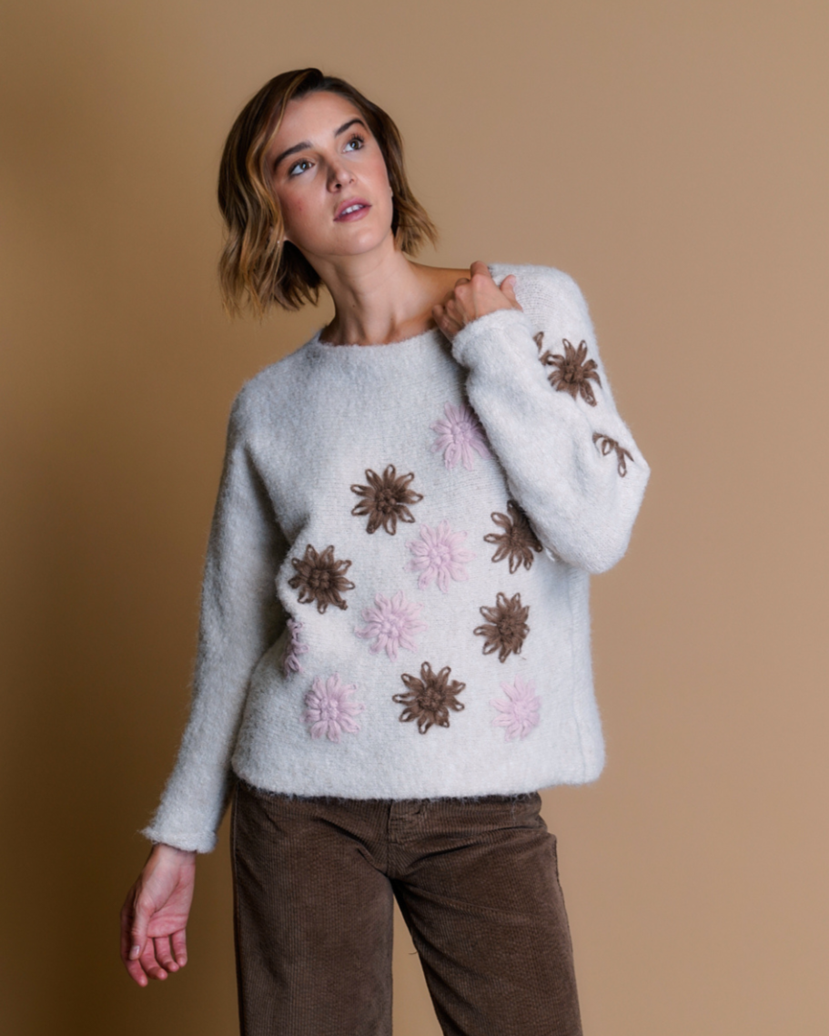 Suéter de lana Ricamo Margherite, con flores tejidas en 3D que aportan textura y detalle artesanal. Fit holgado y cuello ancho para un look cómodo y bohemio.