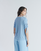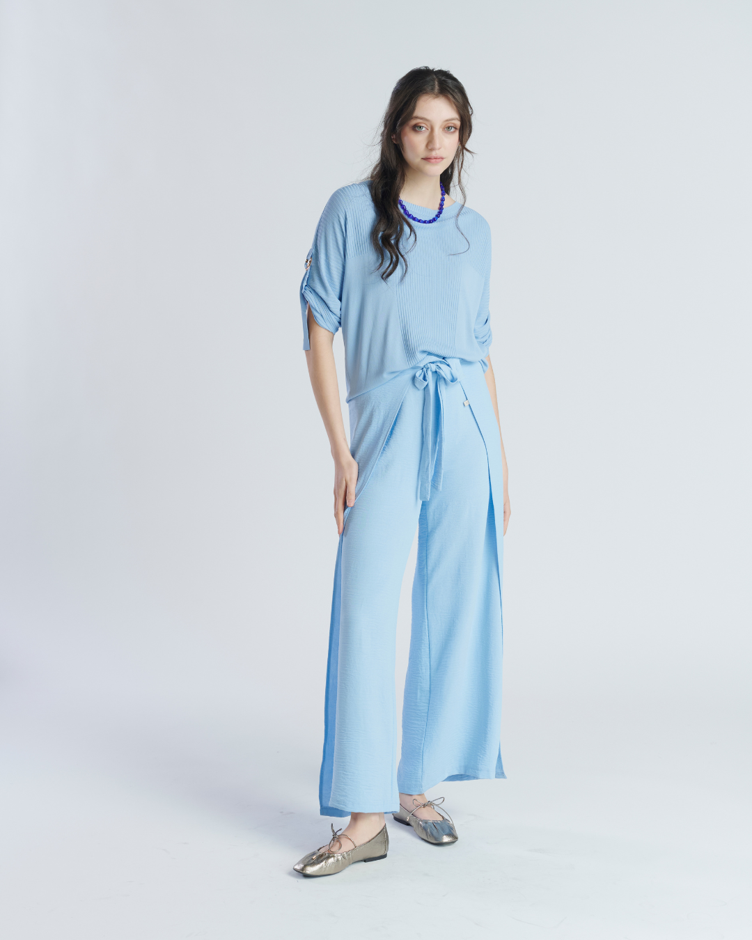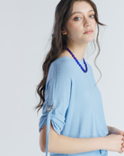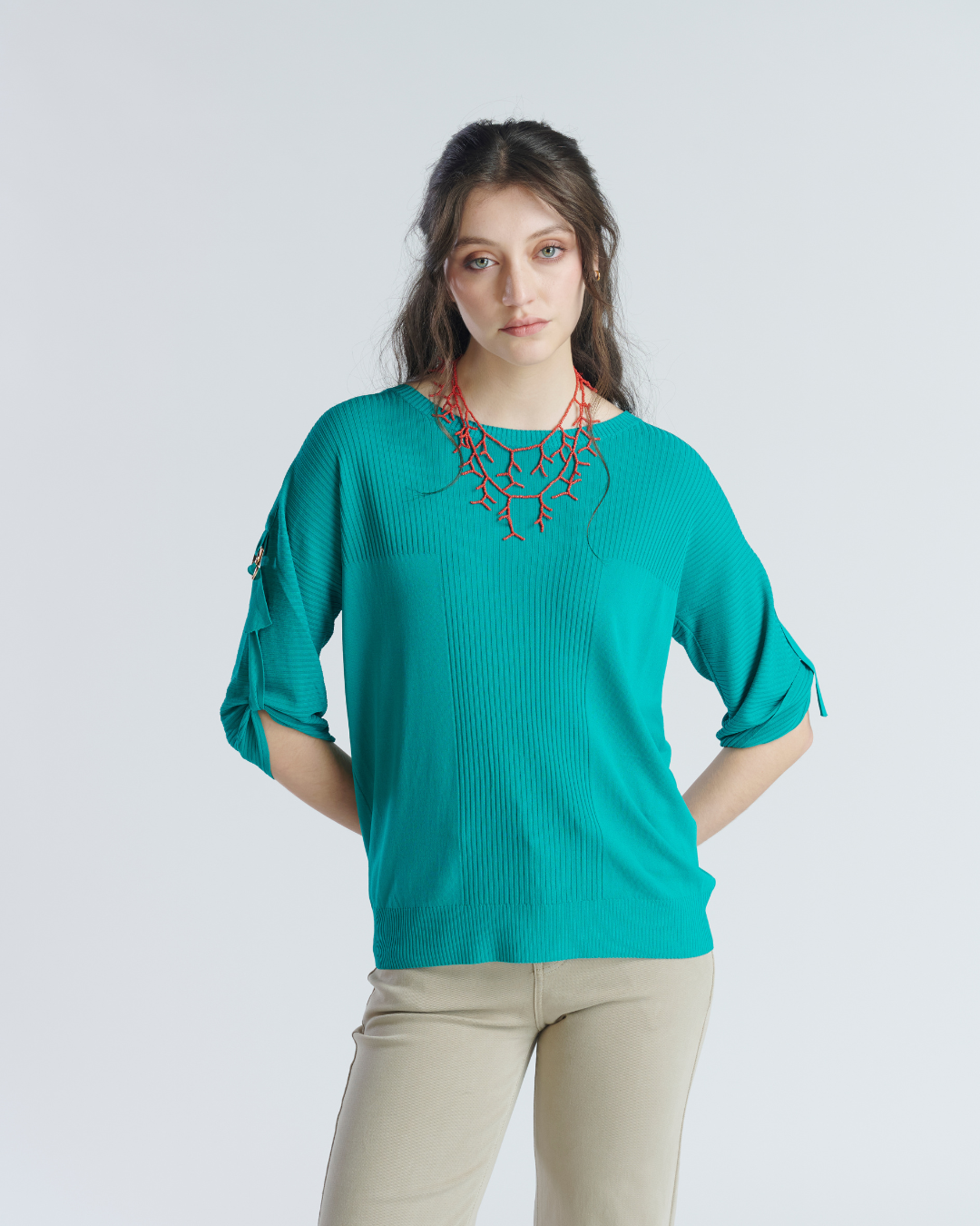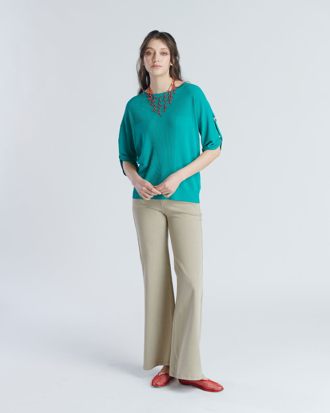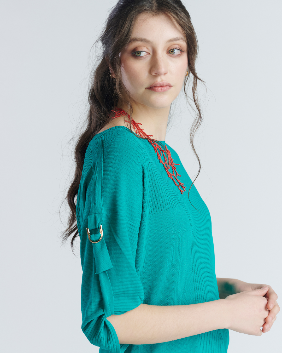 Blusa de diseño moderno confeccionada en tela acanalada que aporta un efecto visual elegante y estilizado. Mangas 3/4 con detalle de argolla en los brazos. Su caída fluida y cómoda la convierte en una prenda versátil, ideal tanto para looks casuales como para ocasiones más formales.