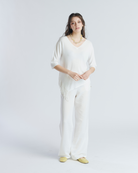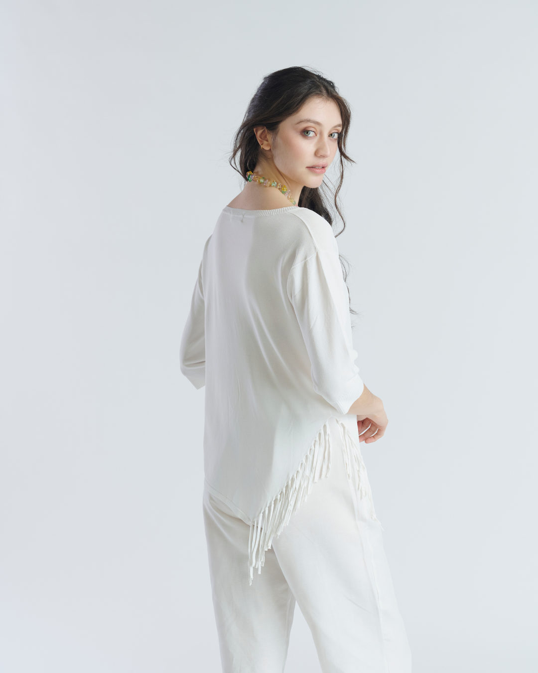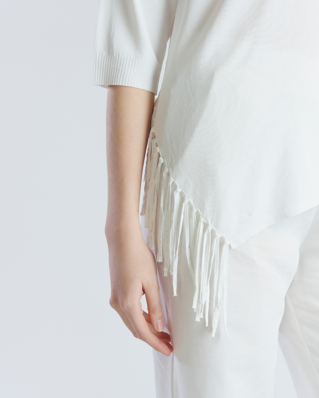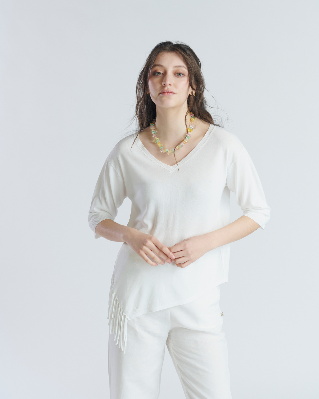 Tejido con escote en V. Manga 3/4 y hombro caído. Flecos que dan un toque chic.