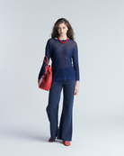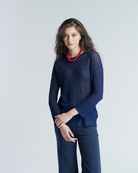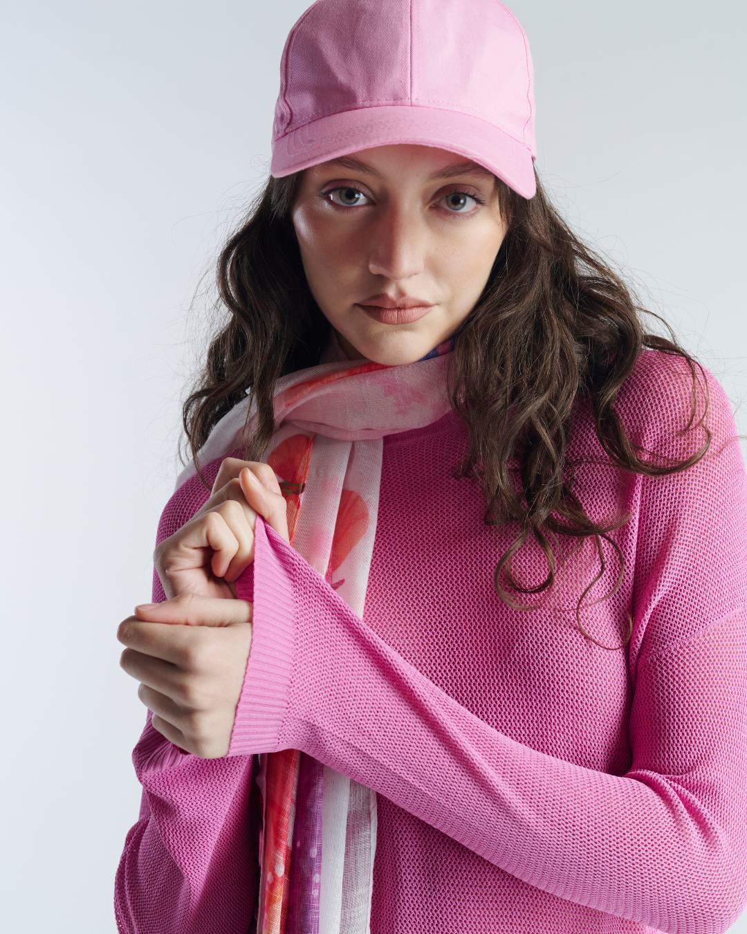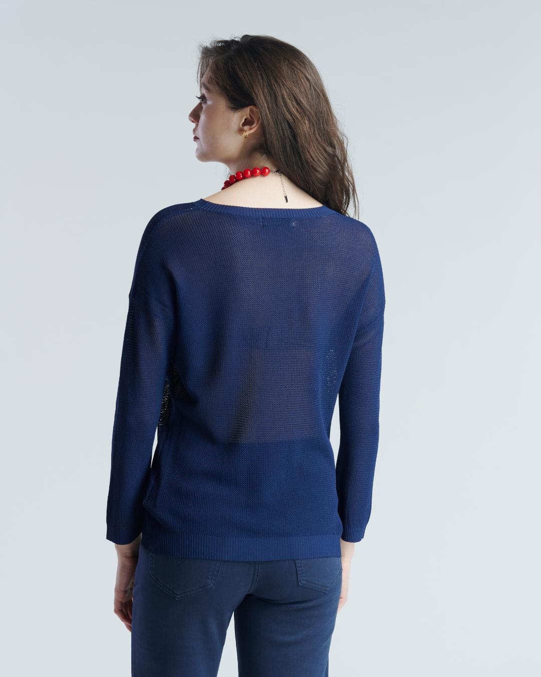 Blusa en tejido de malla manga larga. Hombros ligeramente caídos con cuello redode y ligeramente elasticado en cintura.