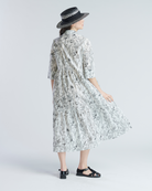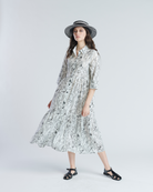 Vestido midi holgado con patrón floral. Mangas 3/4 con puño largo. Cuello camisero y cierre con botones al centro. Fruncido a la cintura para dar movimiento y volumen.