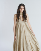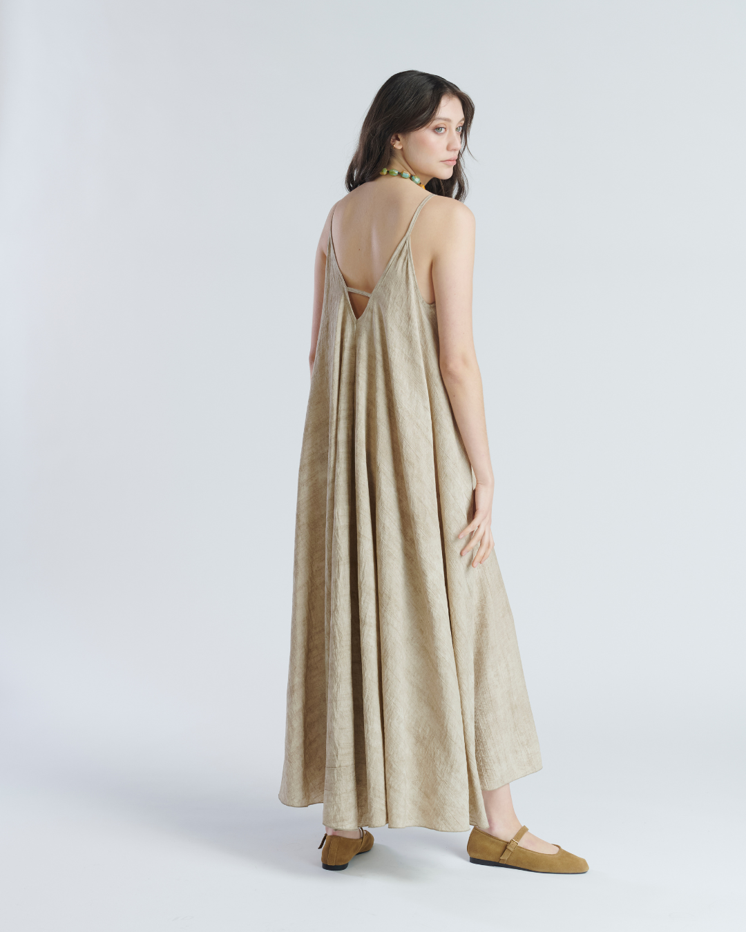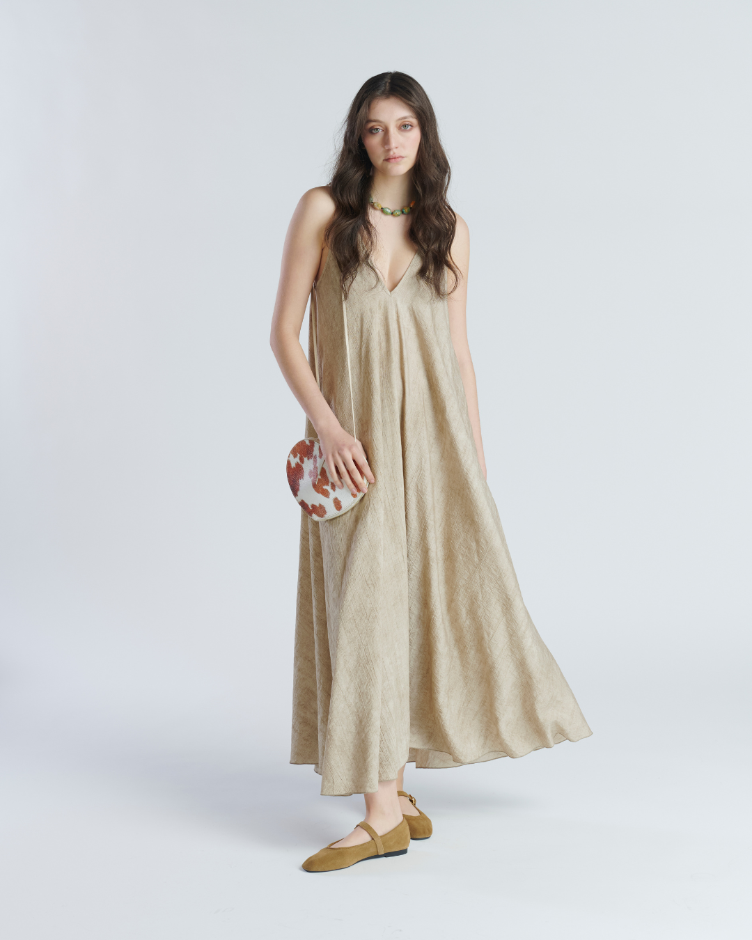 Vestido largo de tacto vaporoso con efecto arrugado. Escote en V y pavilo. Caída suelta y sin forro. Muy liviano y fresco ideal para un look relajado y chic de verano.