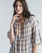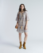 Vestido midi de cuadros multicolor con cordón frontal. Fresco, ligero y lleno de movimiento, este vestido de corte relajado es ideal para un look casual con estilo. Su estampado en cuadros multicolor aporta un aire juvenil y bohemio, mientra que el detalle de cordón con borlas en el escote le da un toque artesanal y femenino. Con magas 3/4 y capuda fluída e capas, es perfecto para los días soleados o para combinar con accesorios en un ook de transición.